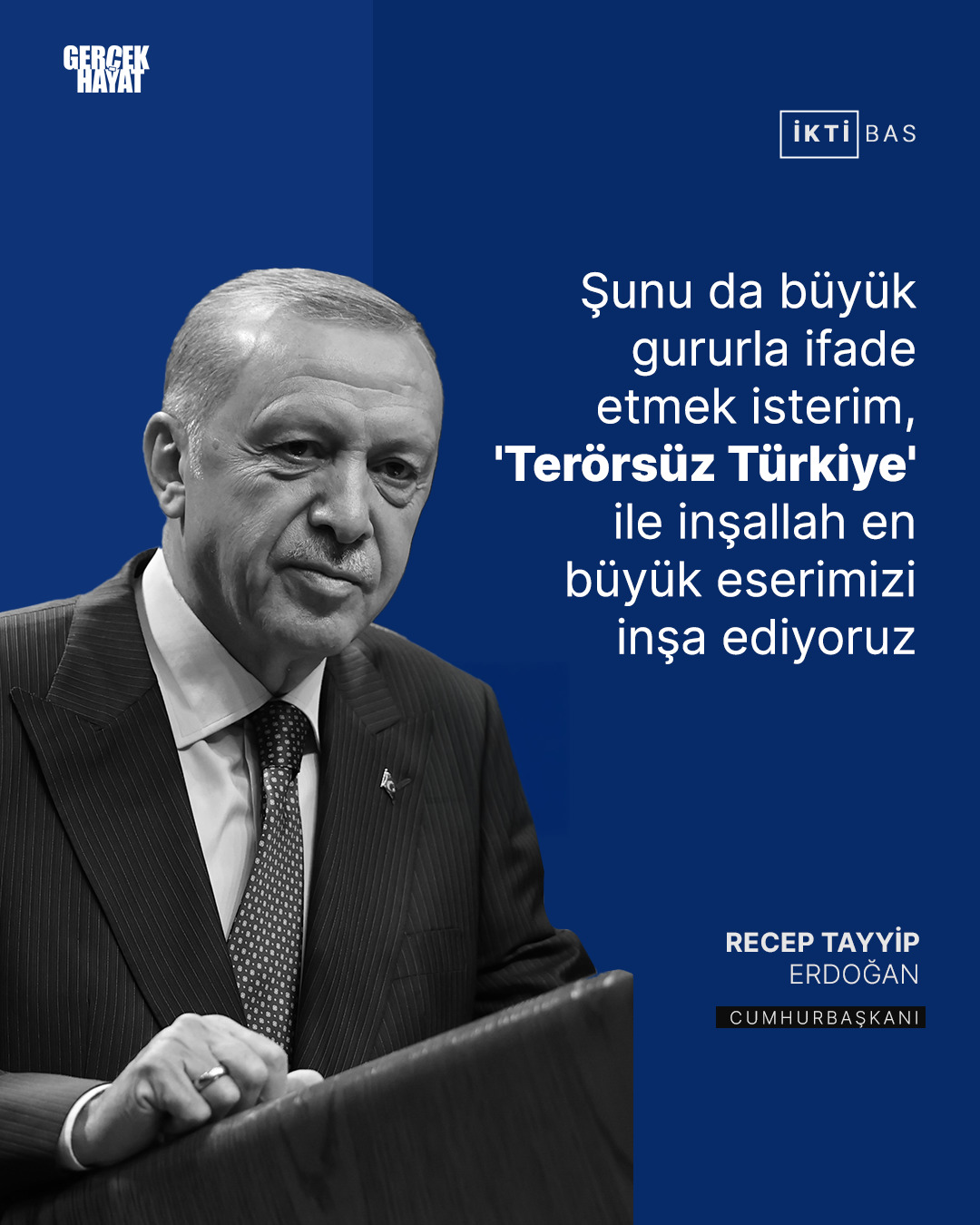 “Teşkilat Akademisi Liderlik Okulu" programında açıklamalarda bulunan Cumhurbaşkanı Erdoğan, terör örgütü PKK'nın fesih kararı hakkında önemli mesajlar verdi. Erdoğan, bölgede terörün kullanım süresinin bittiğini belirterek, silah bırakma sürecini Milli İstihbarat Teşkilatı'nın (MİT) titizlikle izleyeceğini ifade etti. Erdoğan, 'Ne Irak'ta ne de Suriye'de sınırımızda terör örgütlerine tahammülümüz hiçbir zaman olmadı, bundan sonra hiç olmayacak. Şunu da büyük gururla ifade etmek isterim, 'Terörsüz Türkiye' ile inşallah en büyük eserimizi inşa ediyoruz' dedi.