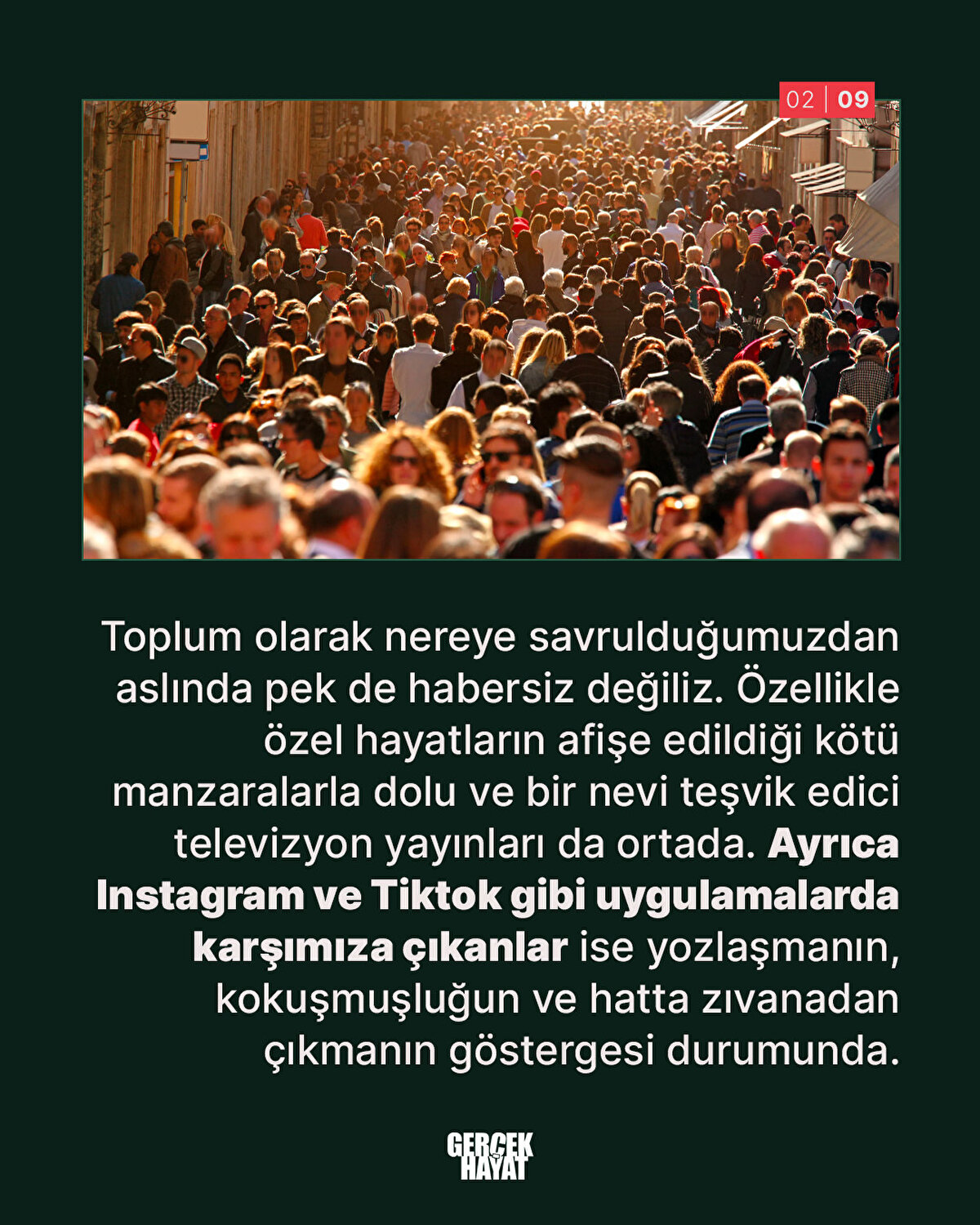 Toplum olarak nereye savrulduğumuzdan aslında pek de habersiz değiliz. Özellikle özel hayatların afişe edildiği kötü manzaralarla dolu ve bir nevi teşvik edici televizyon yayınları da ortada. Ayrıca Instagram ve Tiktok gibi uygulamalarda karşımıza çıkanlar ise yozlaşmanın, kokuşmuşluğun ve hatta zıvanadan çıkmanın göstergesi durumunda.