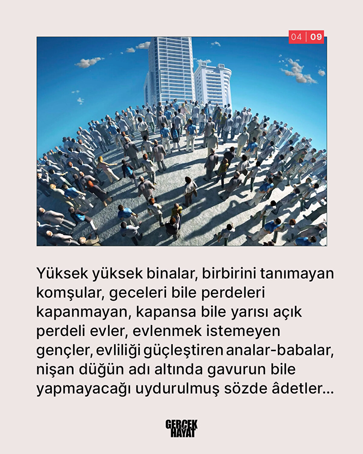 Yüksek yüksek binalar, birbirini tanımayan komşular, geceleri bile perdeleri kapanmayan, kapansa bile yarısı açık perdeli evler, evlenmek istemeyen gençler, evliliği güçleştiren analar-babalar, nişan düğün adı altında gavurun bile yapmayacağı uydurulmuş sözde âdetler…
