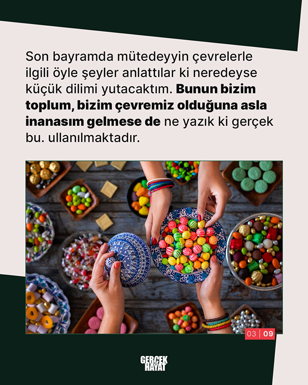 Son bayramda mütedeyyin çevrelerle ilgili öyle şeyler anlattılar ki neredeyse küçük dilimi yutacaktım. Bunun bizim toplum, bizim çevremiz olduğuna asla inanasım gelmese de ne yazık ki gerçek bu.