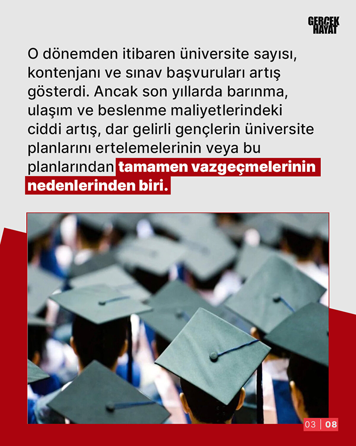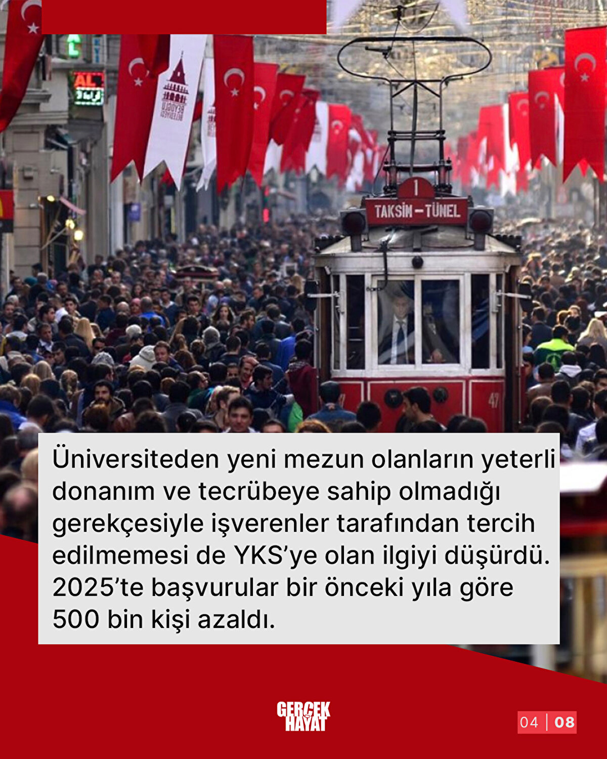 Ancak son yıllarda barınma, ulaşım ve beslenme maliyetlerindeki ciddi artış, dar gelirli gençlerin üniversite planlarını ertelemelerinin veya bu planlarından tamamen vazgeçmelerinin nedenlerinden biri. Üniversiteden yeni mezun olanların yeterli donanım ve tecrübeye sahip olmadığı gerekçesiyle işverenler tarafından tercih edilmemesi de YKS'ye olan ilgiyi düşürdü. 2025'te başvurular bir önceki yıla göre 500 bin kişi azaldı. Elbette tek neden bu değil. Doğurganlık azaldıkça genç sayısı da azalıyor. Yapılan araştırmalarda gençler eskiden olduğu gibi çok geç olmadan bir meslek sahibi olmak istediklerini ifade ediyor. Zira eskiden ya eğitim hayatı yahut çıraklık olmak üzere insanların önünde iki seçenek vardı. Şimdi eğitim zorunlu olunca çıraklık adeta can çekişiyor. Ustalar lise mezunu birini çırak olarak almak istemiyor. Lise mezunu olmuş erişkin bir genç de çıraklığa zaten hevesli değil. Çünkü zorunlu eğitim nedeniyle çok geç kalınmış oluyor.