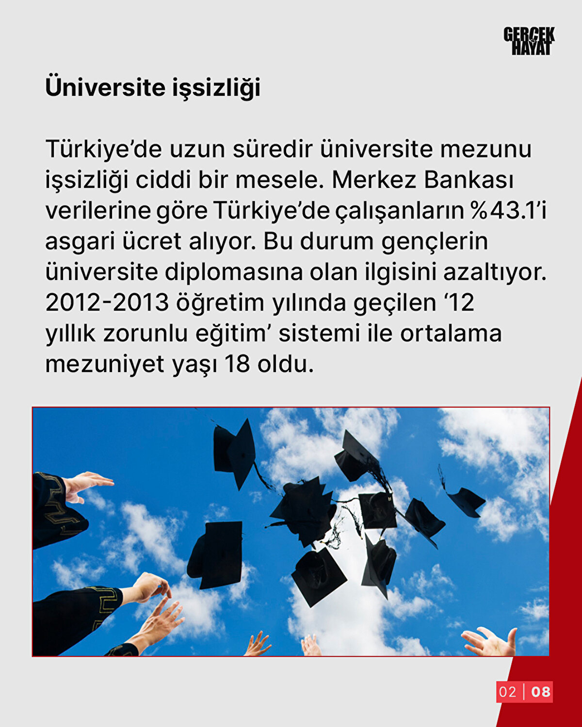 Üniversite işsizliği Türkiye'de uzun süredir üniversite mezunu işsizliği ciddi bir mesele. Merkez Bankası verilerine göre Türkiye'de çalışanların %43.1'i asgari ücret alıyor. Bu durum gençlerin üniversite diplomasına olan ilgisini azaltıyor. 2012-2013 öğretim yılında geçilen '12 yıllık zorunlu eğitim' sistemi ile ortalama mezuniyet yaşı 18 oldu. O dönemden itibaren üniversite sayısı, kontenjanı ve sınav başvuruları artış gösterdi.