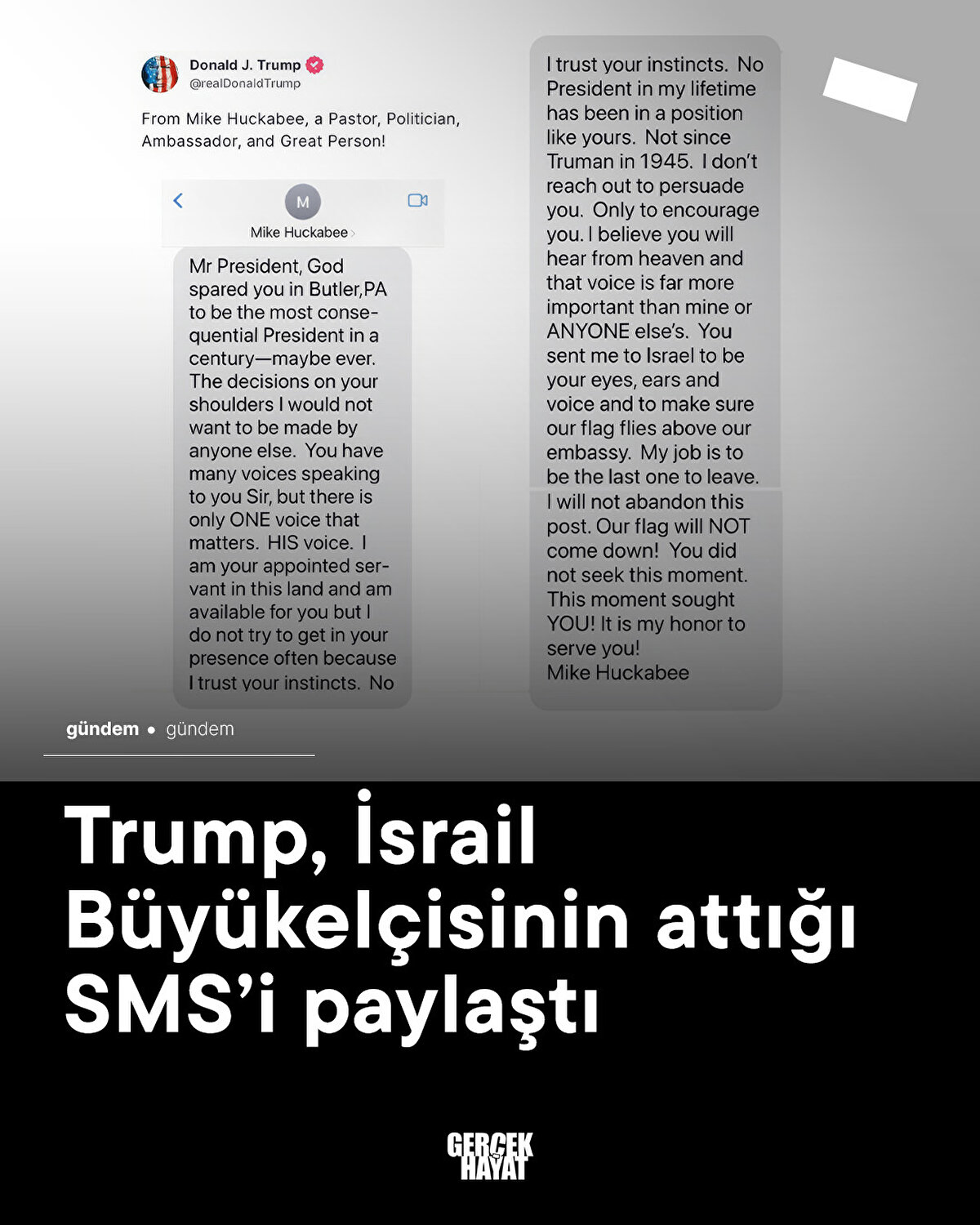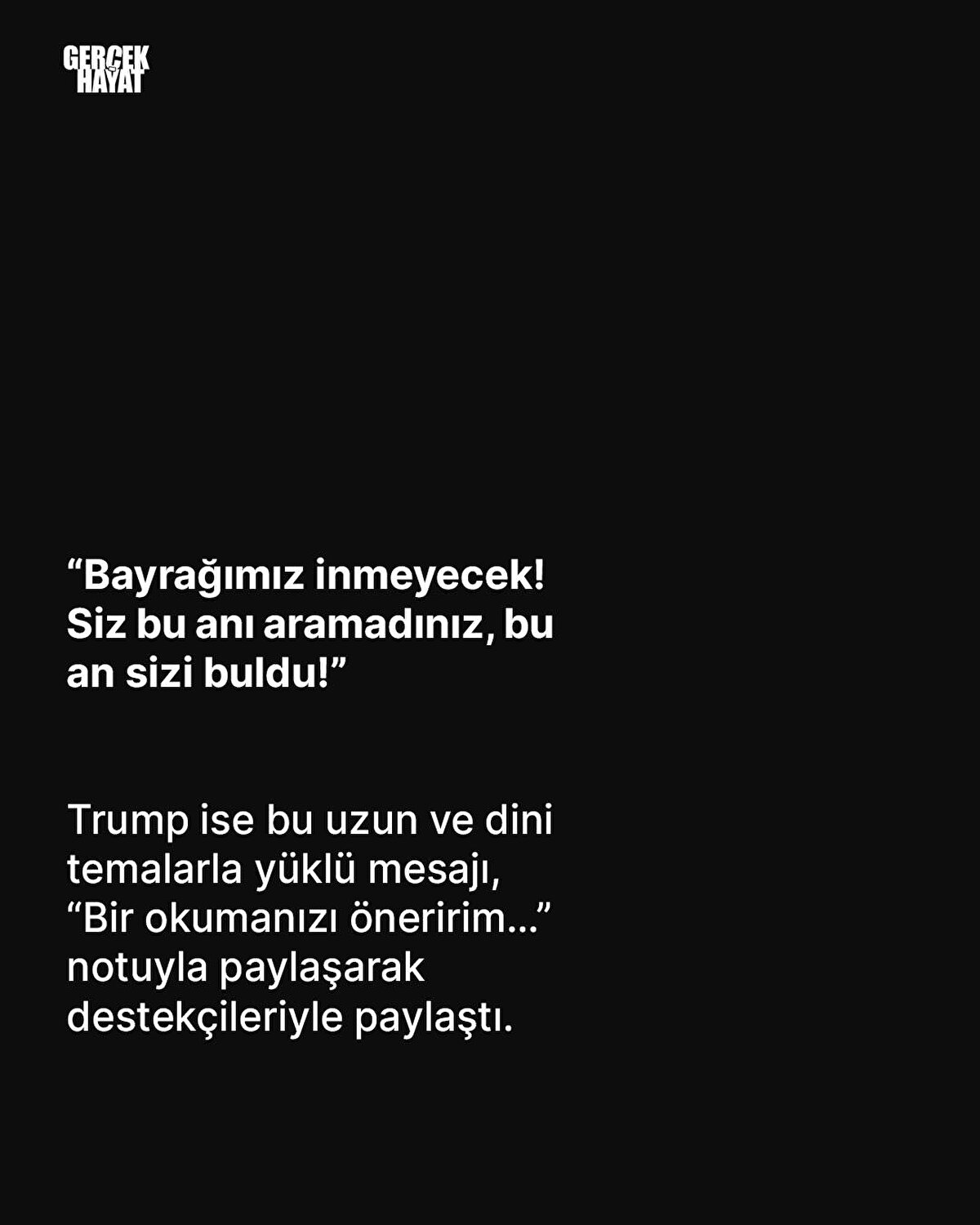 Trump ise bu uzun ve dini temalarla yüklü mesajı, “Bir okumanızı öneririm…" notuyla paylaşarak destekçileriyle paylaştı.