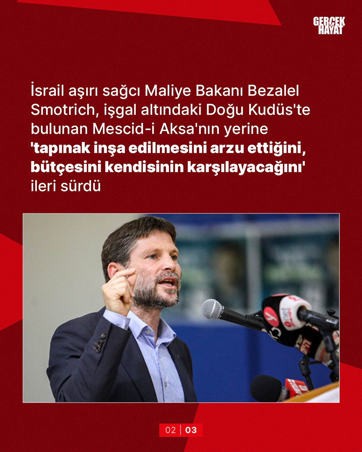 İsrail aşırı sağcı Maliye Bakanı Bezalel Smotrich, işgal altındaki Doğu Kudüs'te bulunan Mescid-i Aksa'nın yerine 'tapınak inşa edilmesini arzu ettiğini, bütçesini kendisinin karşılayacağını' ileri sürdü İsrail, Mescid-i Aksa'nın külliyesinin altında Yahudi mabedi kalıntıları olduğu iddiasıyla kazı yapıyor