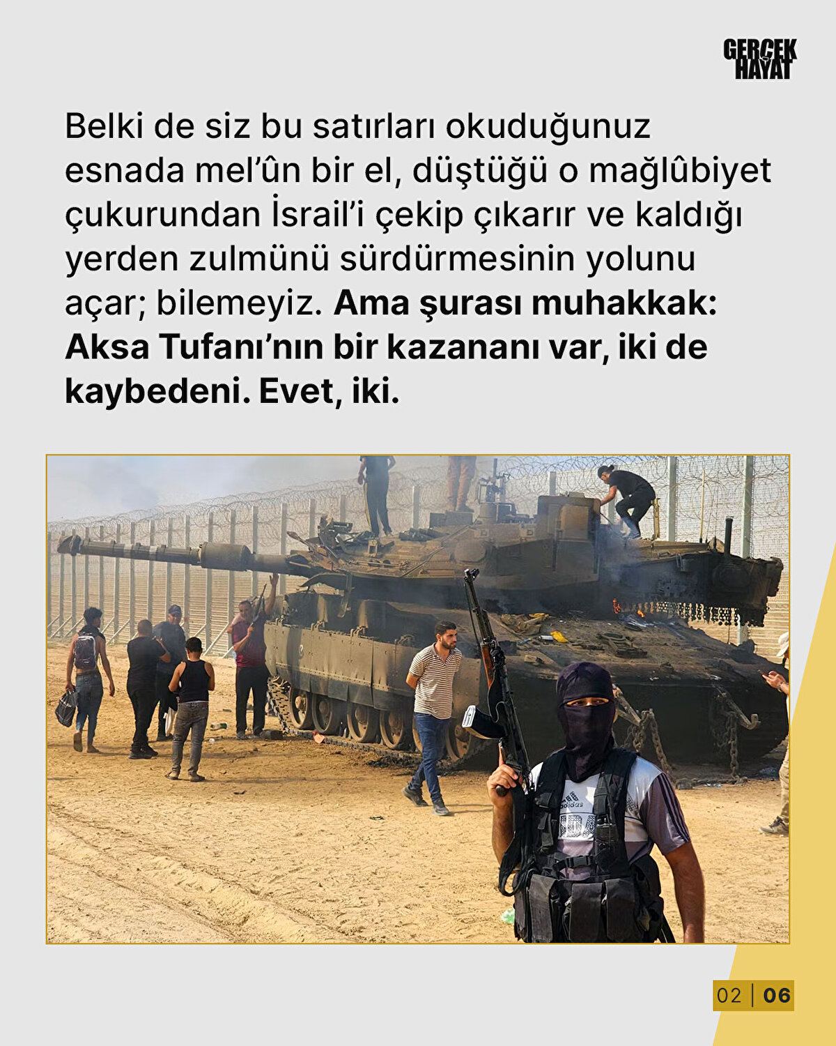 Belki de siz bu satırları okuduğunuz esnada mel'ûn bir el, düştüğü o mağlûbiyet çukurundan İsrail'i çekip çıkarır ve kaldığı yerden zulmünü sürdürmesinin yolunu açar; bilemeyiz. Ama şurası muhakkak: Aksa Tufanı'nın bir kazananı var, iki de kaybedeni. Evet, iki.