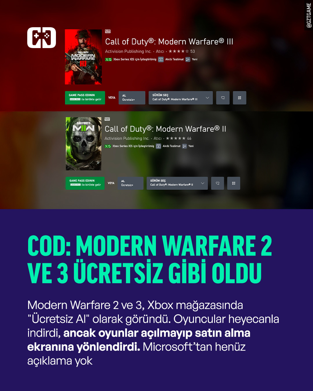 Xbox kullanıcıları, 29 Temmuz itibarıyla Microsoft Store'da şaşırtıcı bir detayla karşılaştı. Call of Duty: Modern Warfare II ve Modern Warfare III'ün dijital sürümleri, mağazada "Ücretsiz Al" seçeneğiyle sunulmaya başlandı. İki oyunun toplam piyasa değeri 5 bin TL'yi aşarken, bu durum oyunseverler arasında büyük heyecan yarattı.