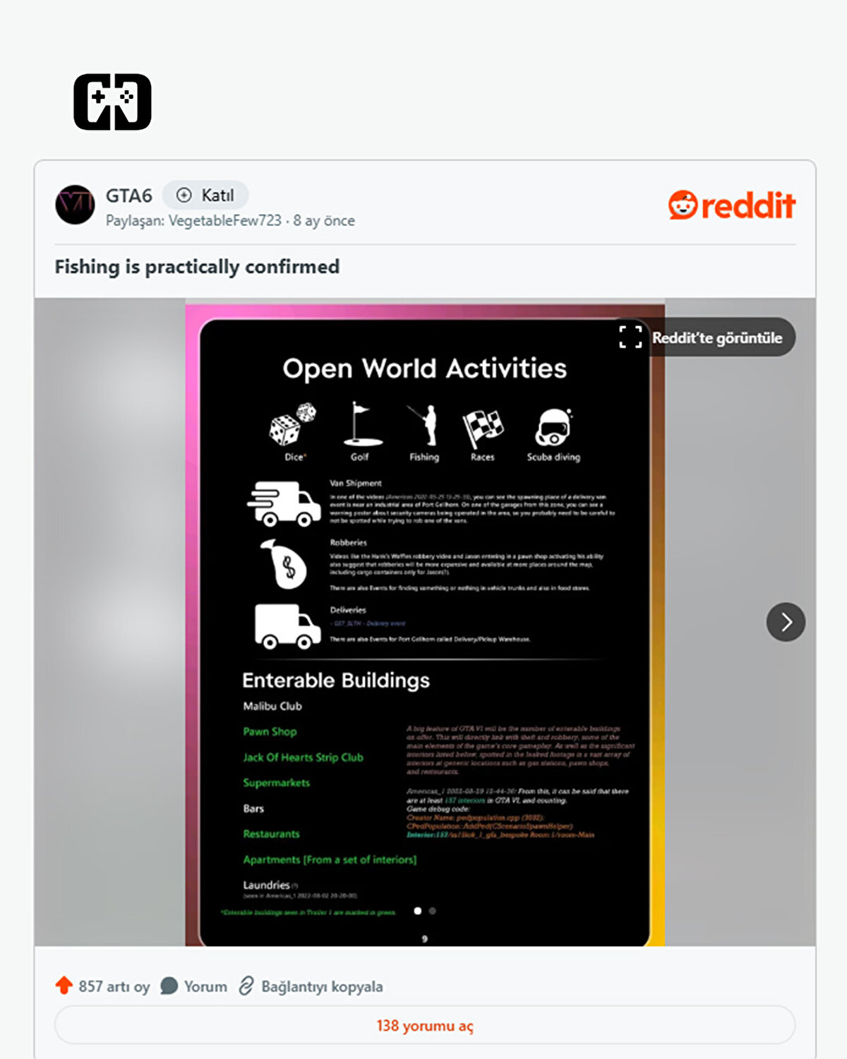 Grand Theft Auto serisinin yeni oyunu GTA 6 hakkında ortaya çıkan son sızıntılar, oyuncular arasında büyük bir heyecan yarattı. Vice City'de geçeceği bilinen yapım, bugüne kadarki en geniş açık dünyalardan birini sunmaya hazırlanıyor. Ancak bu kez ilgi çeken detay, yalnızca devasa harita değil; aynı zamanda oyuna eklenmesi beklenen yeni silahlar ve yan aktiviteler oldu. Sızdırılan bilgilere göre GTA 6'da balıkçılık gibi mini oyunların yanı sıra zıpkın kullanımı da yer alabilir. Özellikle Red Dead Redemption 2'deki etkileşimlere benzer mekaniklerin devreye girmesi ihtimali, toplulukta büyük bir merak uyandırdı. Oyuncular şimdiden Vice City sokaklarında bu silahın yaratacağı olasılıkları tartışmaya başladı. Öte yandan GTA 6'da polis yapay zekâsının önceki oyunlara kıyasla çok daha gelişmiş olacağı da öne sürülüyor. Bu durum, Vice City'de oyuncuların yaratacağı kaosun kısa süre içinde bastırılabileceğine işaret ediyor. Rockstar Games tarafından resmi olarak doğrulanmayan bu bilgiler, yine de GTA topluluğunun beklentilerini yükseltmiş durumda. Serinin şimdiye kadarki en büyük ve en detaylı oyunu olması beklenen GTA 6, Vice City'de oyunculara eşi benzeri görülmemiş bir deneyim sunmaya hazırlanıyor.