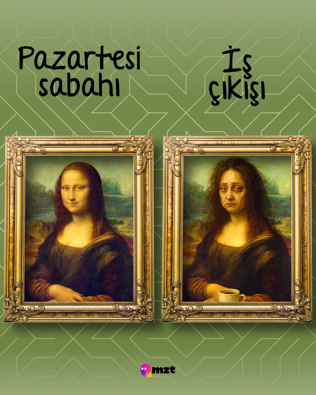 Günün Sonunda Gerçekler Ancak “İş çıkışı” karelerine geçtiğimizde işler değişiyor. Aynı karakterlerin yüzündeki ifade yorgunluk, şaşkınlık veya tükenmişlikle dolu. Mona Lisa'nın tebessümü kaybolmuş, İnci Küpeli Kız artık göz altı morluklarıyla karşımızda, Çığlık tablosu ise tam anlamıyla işten çıkış trafiğinin ruh hâlini betimliyor. Bu görseller, haftanın başında taşıdığımız motivasyonun, günün sonunda gerçeklerle nasıl eridiğini hem mizahi hem de sanatsal bir dille anlatıyor.