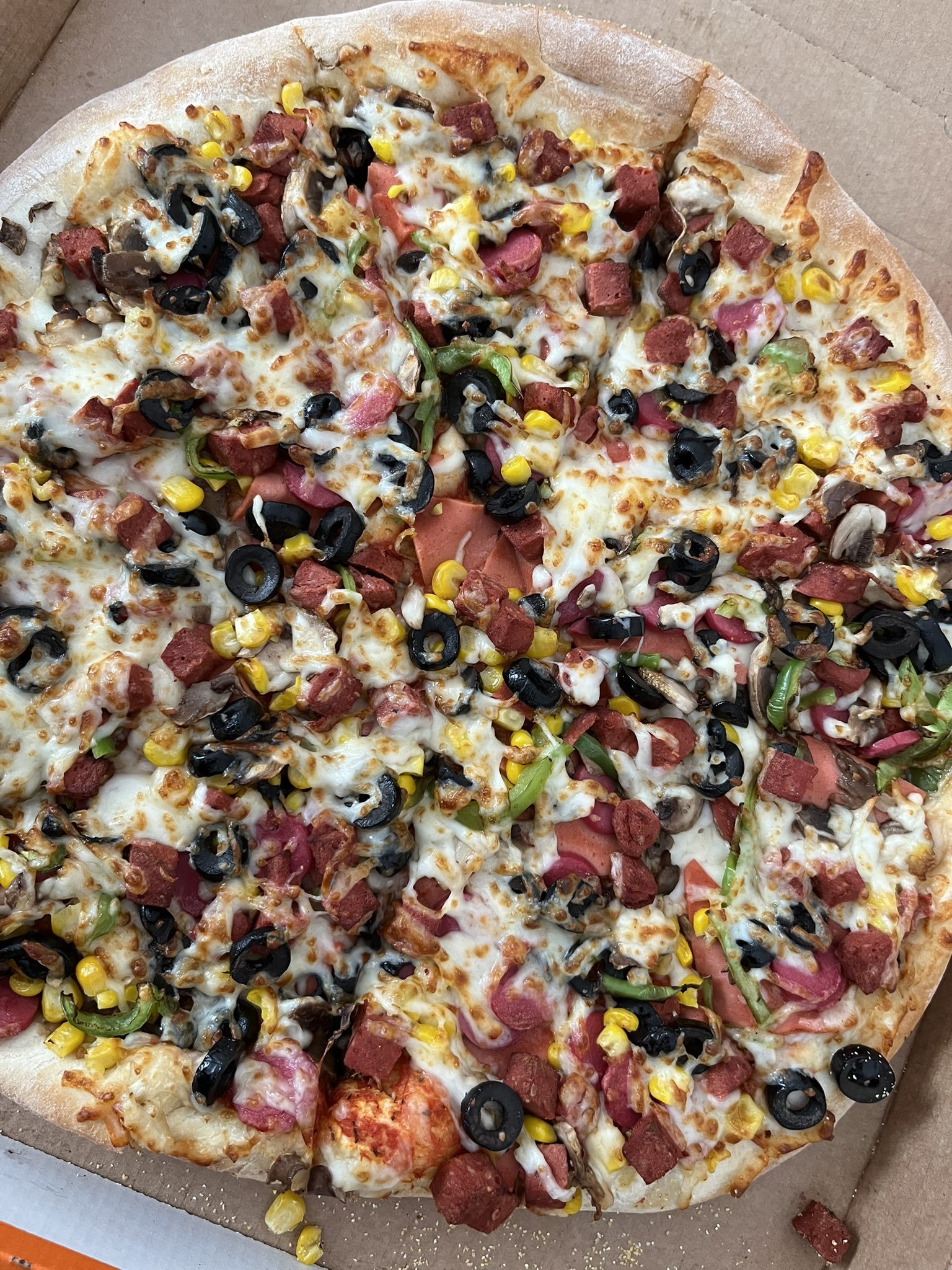 Dışarıdan "bol malzemeli karışık pizza" adı altında aldığımız üzerine birkaç malzemenin serpiştirildiği pizzalardan sonra evde hazırladığımız pizzadaki malzeme yoğunluğu şu minvaldedir.