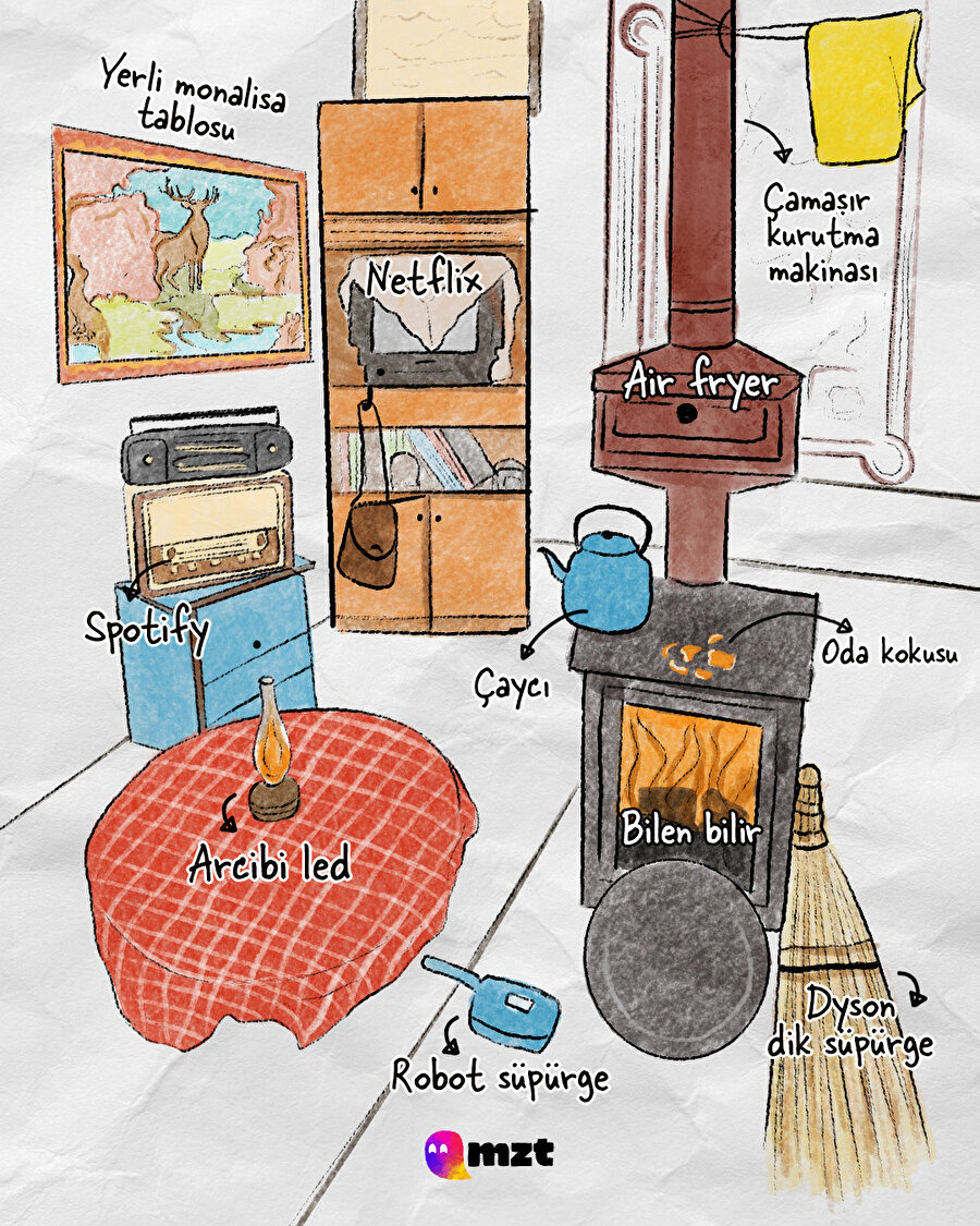Çizimde yer alan detaylar, geçmiş dönemlerin klasik eşyalarını günümüz teknolojik ürünleriyle eşleştiriyor. Odadaki soba “Air Fryer", eski tip radyolar “Spotify", televizyonun üzerindeki tül detayıyla “Netflix" olarak tasvir edilmiş. Bu karşılaştırmalar hem eski kuşakların alışkanlıklarını hem de günümüz teknolojisinin hayatımıza nasıl entegre olduğunu esprili bir biçimde hatırlatıyor. Özellikle sobanın yanındaki “Dyson dik süpürge" olarak adlandırılmış klasik süpürge ve “robot süpürge" yerine geçen faraş detayı, mizahın tam kalbinde yer alıyor.