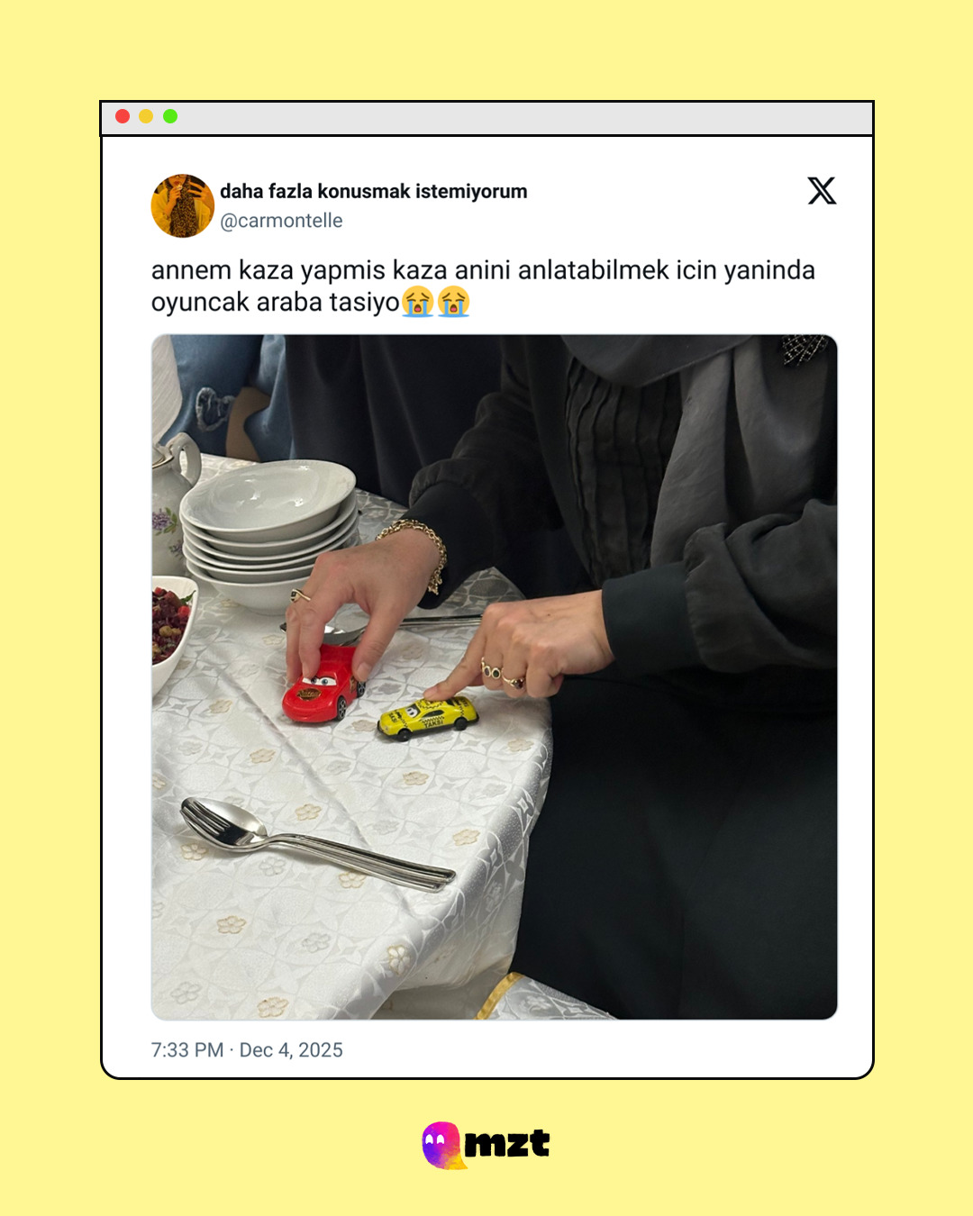 Bir Twitter kullanıcısının paylaştığı içten ve bir o kadar da komik an, sosyal medyanın gün içindeki en neşeli konu başlıklarından biri hâline geldi. Kullanıcının aktardığına göre annesi kısa süre önce küçük bir kaza geçirmiş. Ancak olayı anlatırken herkesin tam olarak anlamadığını fark eden anne, çözümü oldukça yaratıcı bir yöntemde bulmuş: Çantasına iki adet oyuncak araba koymak. Gittiği her ortamda, masanın üzerine arabaları yerleştirip çarpışma anını adeta bir trafik polisi titizliğiyle canlandırarak anlatan annenin bu tatlı çabası hem mizahi hem de sıcak bir tablo ortaya koydu.