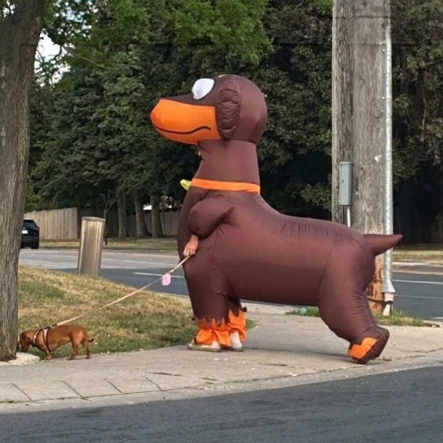 Kanada'da bir kişinin, köpeğinin türü olan dachshund kostümünü giyerek onu gezdirmesi görenleri hem şaşırttı hem de gülümsetti. Uzun gövdeli sevimli köpeğiyle yan yana yürüyen adam, adeta minik dostuyla bir bütün haline gelmişti. Sahip ile köpeğin böylesine uyumlu bir görüntü sergilemesi, sokaktan geçenlerin dikkatini çektiği kadar izleyenlere de keyifli anlar yaşattı.