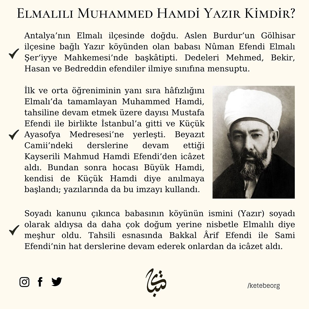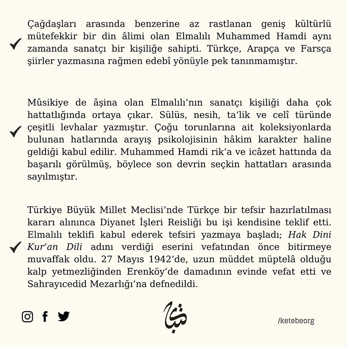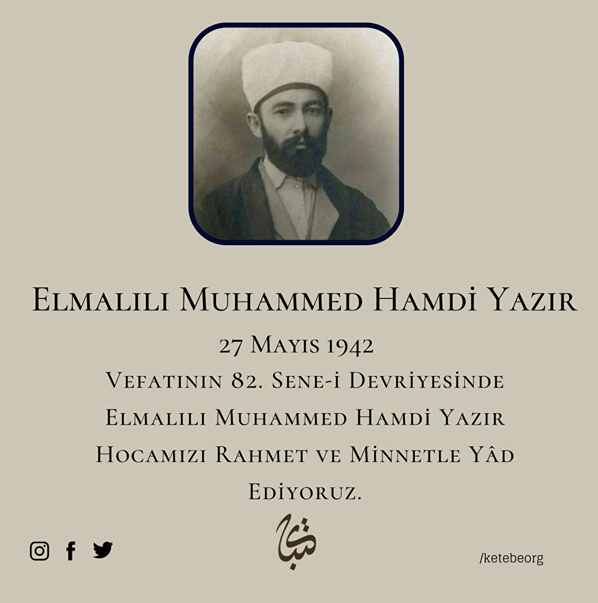 Büyük Türk müfessiri ve hattat Elmalılı Muhammed Hamdi Yazır Hocamızı, vefatının 82. sene-i devriyesi münasebetiyle rahmet ve minnetle yâd ediyoruz.
