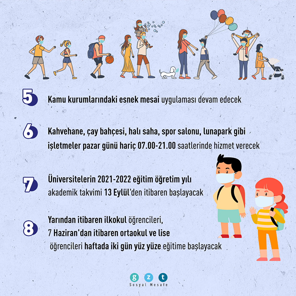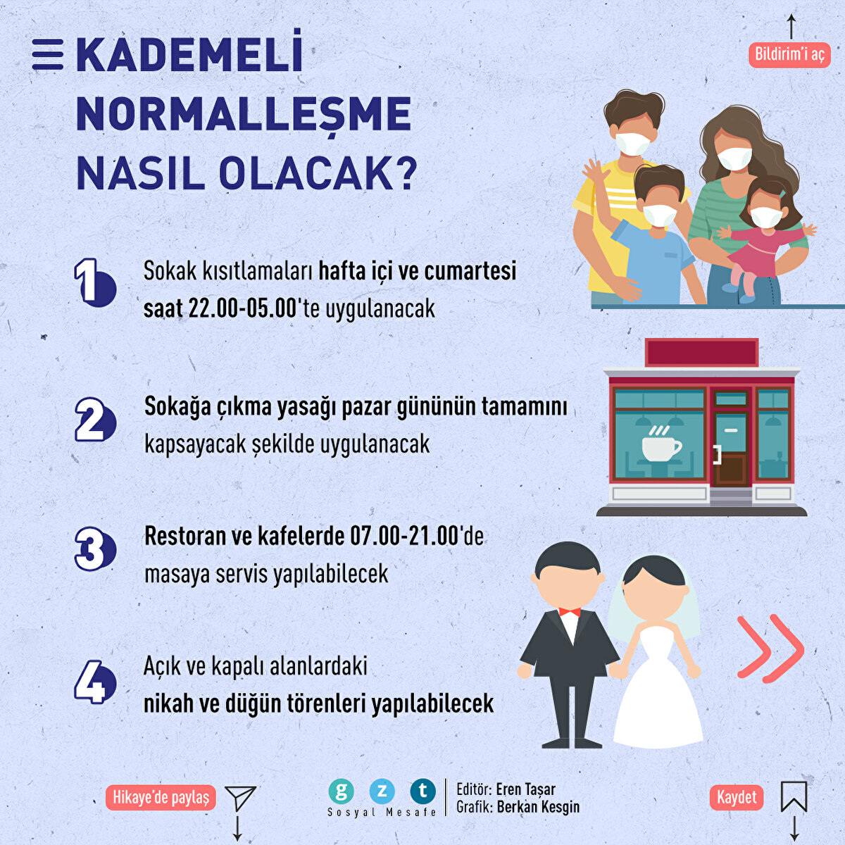 Cumhurbaşkanı Erdoğan, 1 Haziran sonrası normalleşme adımlarının ele alındığı Kabine sonrası konuştu. Alınan normalleşme kararları kapsamında; haziran boyunca sokağa çıkma kısıtlaması hafta içi ve cumartesi günü için akşam 22.00 ile sabah 05.00 arasında devam edecek. Bu sınırlama, cumartesi 22.00 ile pazartesi 05.00 arasında yani pazar gününü tam kapsayacak şekilde uygulanacak.