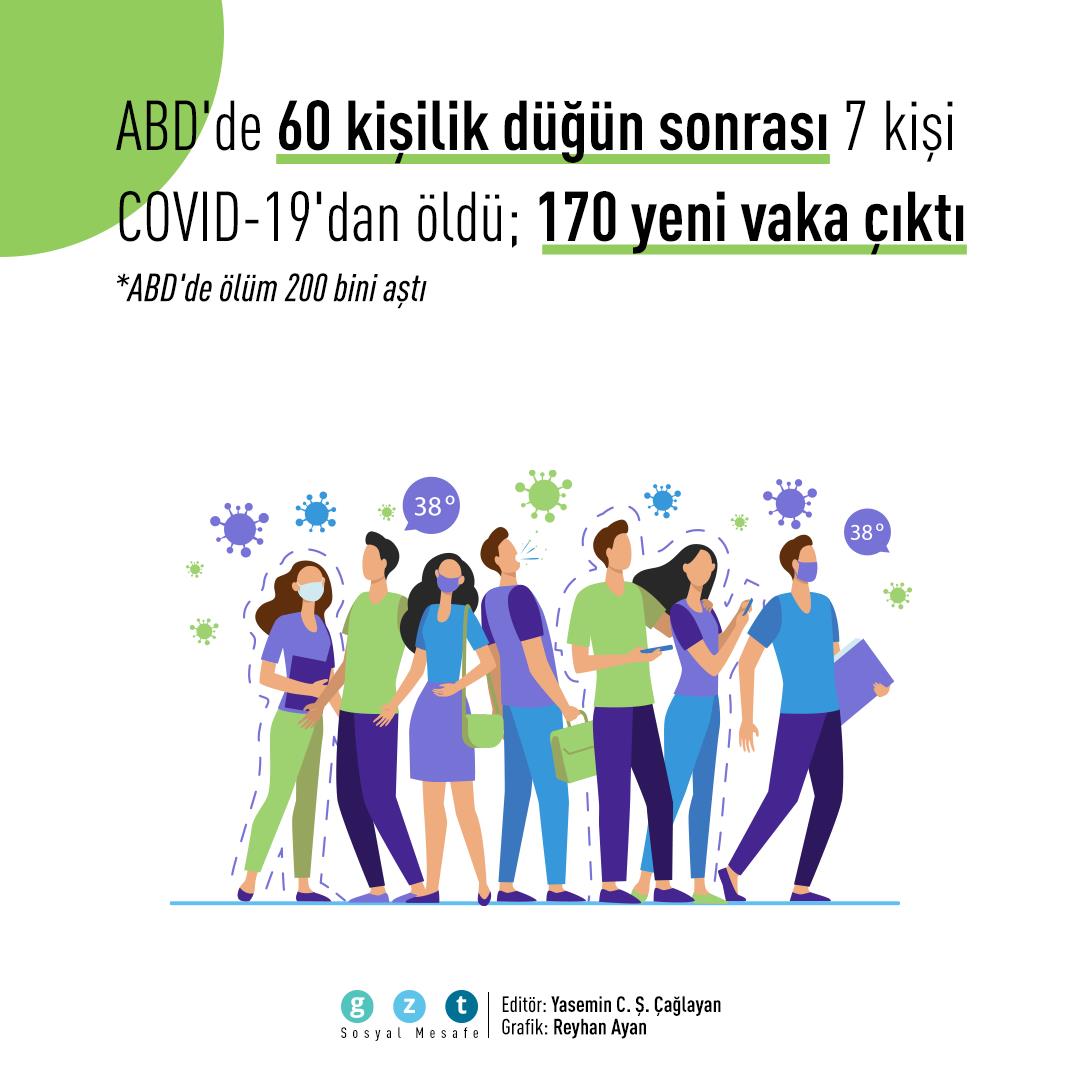 ABD'de geçen ay 60 kişinin katılımıyla yapılan düğün koronavirüs bulaş zincirine neden oldu. Şimdiye kadar 7 ölüm ve en az 170 COVID-19 vakasının kaynağı aynı düğüne dayanıyor. Düğünün kapalı alanda, sosyal mesafesiz ve maskesiz gerçekleştirildiği belirtildi.