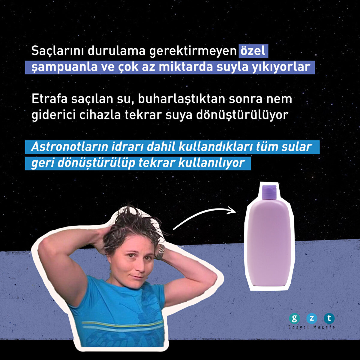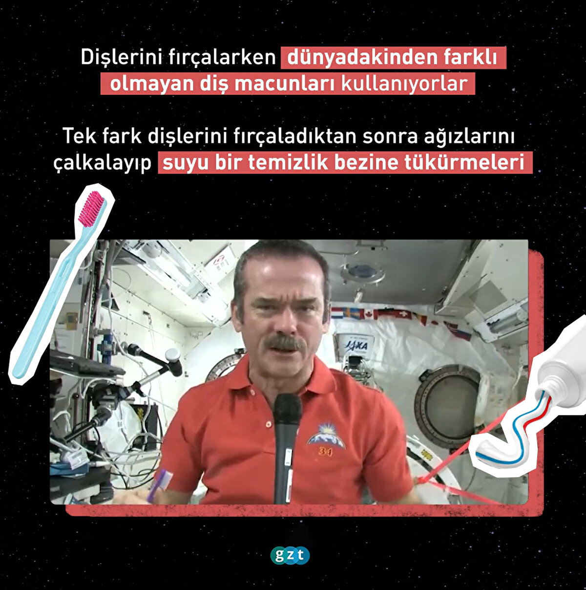 Özellikle Uluslararası Uzay İstasyonu'ndaki (ISS) astronotların görüntüleri her gün internette görüyoruz. Uzun süreler uzayda kalan bu astronotların sağlıkları için uzayda spor yapmaları, düzenli yemek yemeleri ve bakımlarını yapmaları gerekiyor. Tabii ki uzayda bunları yapmak o kadar da kolay değil.