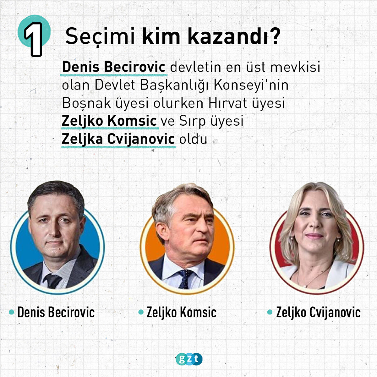 Bosna Hersek'te 2 Ekim Pazar günü yapılan genel seçimlerde resmi olmayan sonuçlara göre Devlet Başkanlığı Konseyinin Boşnak üyesi Denis Becirovic, Hırvat üyesi Zeljko Komsic ve Sırp üyesi de Zeljka Cvijanovic oldu. Merkez Seçim Komisyonu (CIK), seçime katılımın yüzde 50 olduğunu açıkladı. Seçimlere 90'ı siyasi parti, 17'si bağımsız aday ve 38'i koalisyon olmak üzere 145 siyasi unsur katıldı.