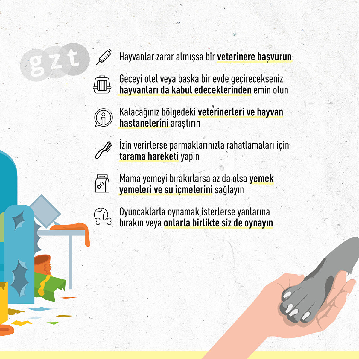 Hayvan dostlarımızla olan ilişkilerimiz, bir doğal afet öncesinde, esnasında ve sonrasında hayatta kalma olasılığını olumlu yönde etkileyebiliyor. Bunun en önemli sebebi ise, bizlerle birlikte yaşayan hayvanları koruma arzumuzun, doğal afetlerle baş etmek için planlama yapmamıza ve doğal afetlere hazırlıklı olmamıza yardımcı olması. Bunlarla birlikte, deprem sonrasında hayvanları mümkün olduğu kadar güvende tutmaya ve olası stres belirtilerini gözlemlemeye çalışabiliriz.