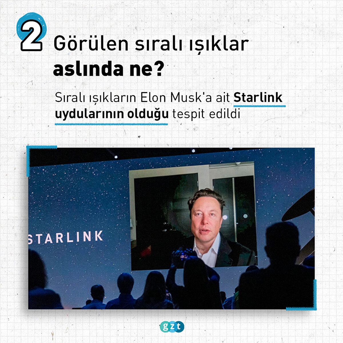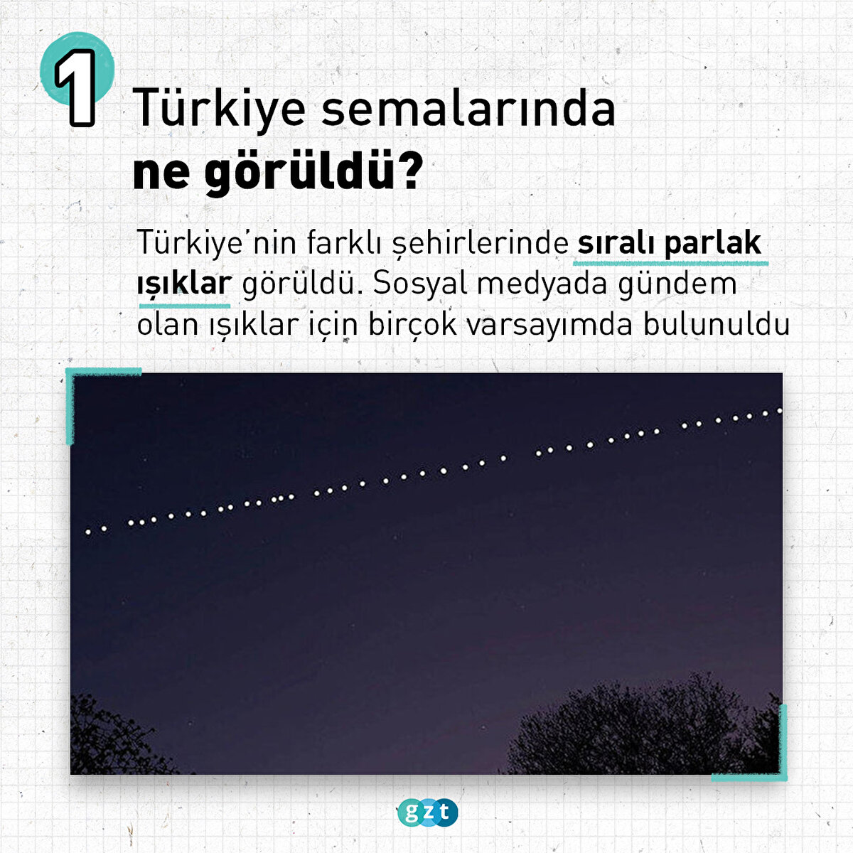 Dün gece sıralı ışıkları görenler telefonlara sarıldı. Sosyal medyada gündem olan ışıklar için çeşit çeşit varsayımlarda bulunuldu. Sıralı ışıkların Elon Musk'a ait Starlink uydularının olduğu tespit edildi. Türkiye Uzay Ajansı (TUA), Türkiye'nin çeşitli noktalarından görüntülenen 'Starlink' uydularının dünya üzerinde internet ve haberleşme için başlatılan bir uydu takım yıldızı projesi olduğunu bildirdi. Starlink'e dahil tüm detayları sizin için derledik.