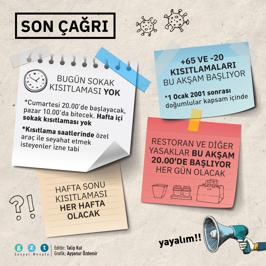 1- Sokağa çıkma kısıtlaması cumartesi saat 20.00'de başlıyor, pazar 10.00'da bitiyor 2- Pazar saat 20.00'de başlayan sokağa çıkma kısıtlaması pazartesi sabah 05.00'te bitecek 3- İkinci bir genelge yayınlanana kadar her hafta sonu kısıtlama var 2- Cuma saat 20.00'den sonra yeni kısıtlamalar devreye giriyor (Ara başlık gibi olabilir) 3- 65 yaş ve üzeri vatandaşlar 10.00-13.00 saatlerinde dışarı çıkabilecek 4- 1 Ocak 2001 sonrasında doğan 20 yaş altı çalışmayan gençler 13.00 - 16.00 saatlerinde dışarı çıkabilecek 5- Lokanta ve restoranlar 10.00 - 20.00 saatlerinde gel-al servisine açık, 20.00'den sonra paket servis hizmeti verecek 6- Nikahlar 2 Eylül'deki genelgeye göre yapılabilecek, değişiklik yok 7- Kısıtlama saatlerinde özel araç ile seyahat etmek isteyenler izne tabi