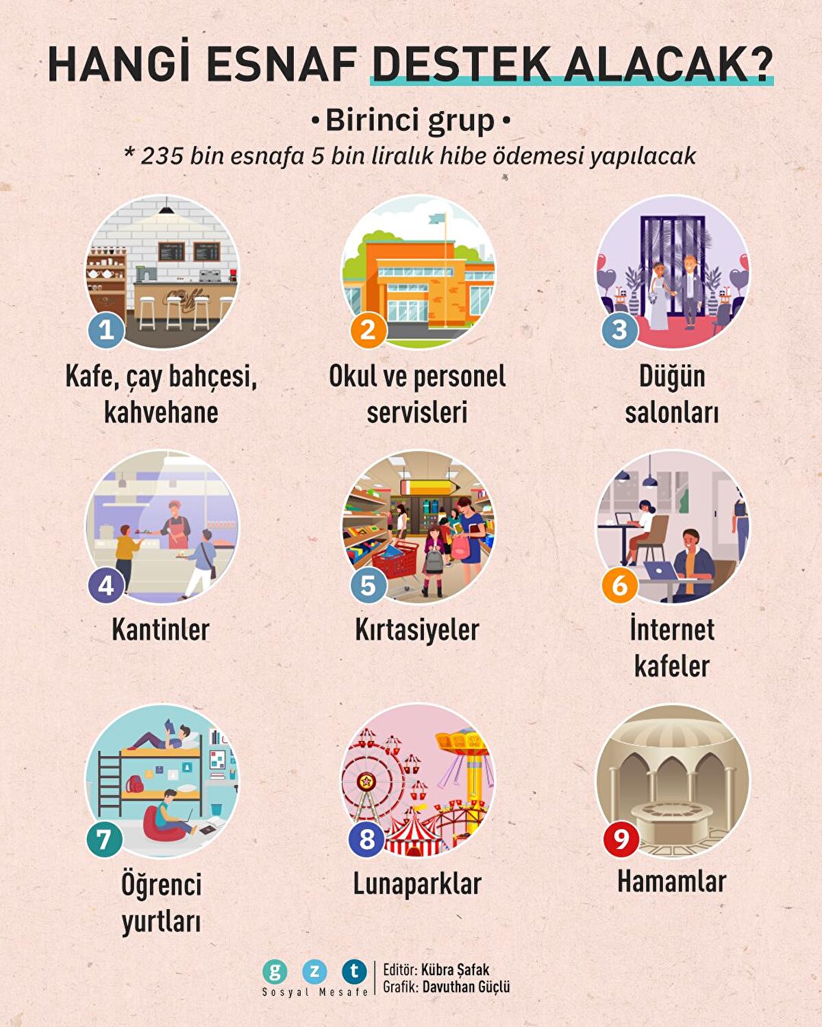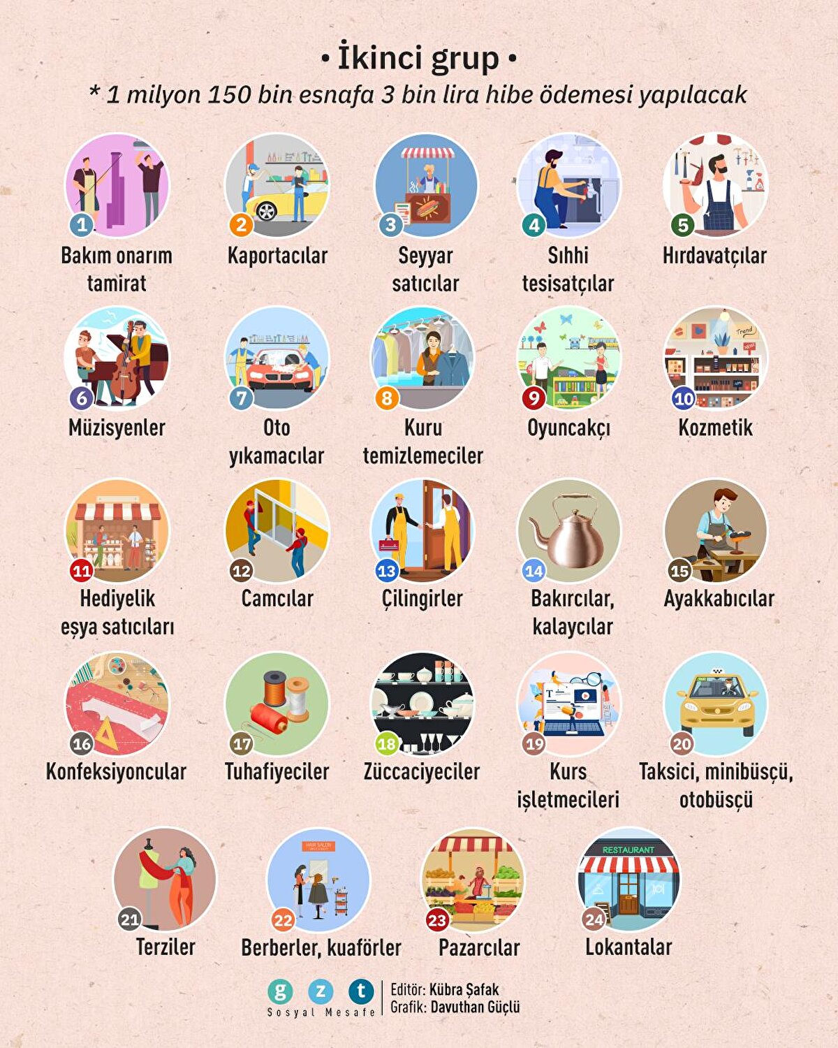 Cumhurbaşkanı Erdoğan, ''Esnaflarımıza yönelik yeni bir destek programın müjdesini sizlerle paylaşmak istiyorum. Salgın tedbirleri sebebiyle işlerine ara vermek mecburiyetinde kalan esnafımıza iki grup halinde destek oluyoruz. Birinci grup kahvehane, kafe, çay bahçesi, okul personel servisi, düğün salonu, öğrenci yurdu, hamamlar, kırtasiyeler, internet kafeler, lunaparklar gibi yerler yer almaktadır. Sayıları toplam 235 bine ulaşan bu işletmelere bir defaya mahsus 5 bin liralık hibe ödemesi yapacağız. İkinci grupta ise bakım, onarım, tamirat, kaporta işleriyle uğraşanlar, seyyar satıcılar, sıhhi tesisat, hırdavat, müzisyen, oto yıkamacı, kuru temizlemeci, oyuncak, kozmetik, camcı, çilingir, bakırcı, kalaycı, ayakkabı, konfeksiyon, zücaciye, tuhafiye ve kurs işletmeleri yer alacaktır. Lokantalar, pastaneler, dondurma, berber, taksici, minibüsçü, otobüsçü, pazarcılar da bu gruba dahildir. Bu gruptaki vatandaşlarımıza bir defaya mahsus 3 bin lira hibe ödemesi vereceğiz. İki ayrı grup 1 milyon 384 binde fazla esnafa karşılıksız olarak veriyoruz. Tüccar, sanayici, büyük şirketler için de nefes kredisi adı altında kolaylık sağlayacak yeni adım atıyoruz. Detayları Hazine ve Maliye Bakanlığımız tarafından açıklanacak destek programlarının ülkemize ve milletimize hayırlı olmasını diliyorum.'' dedi.