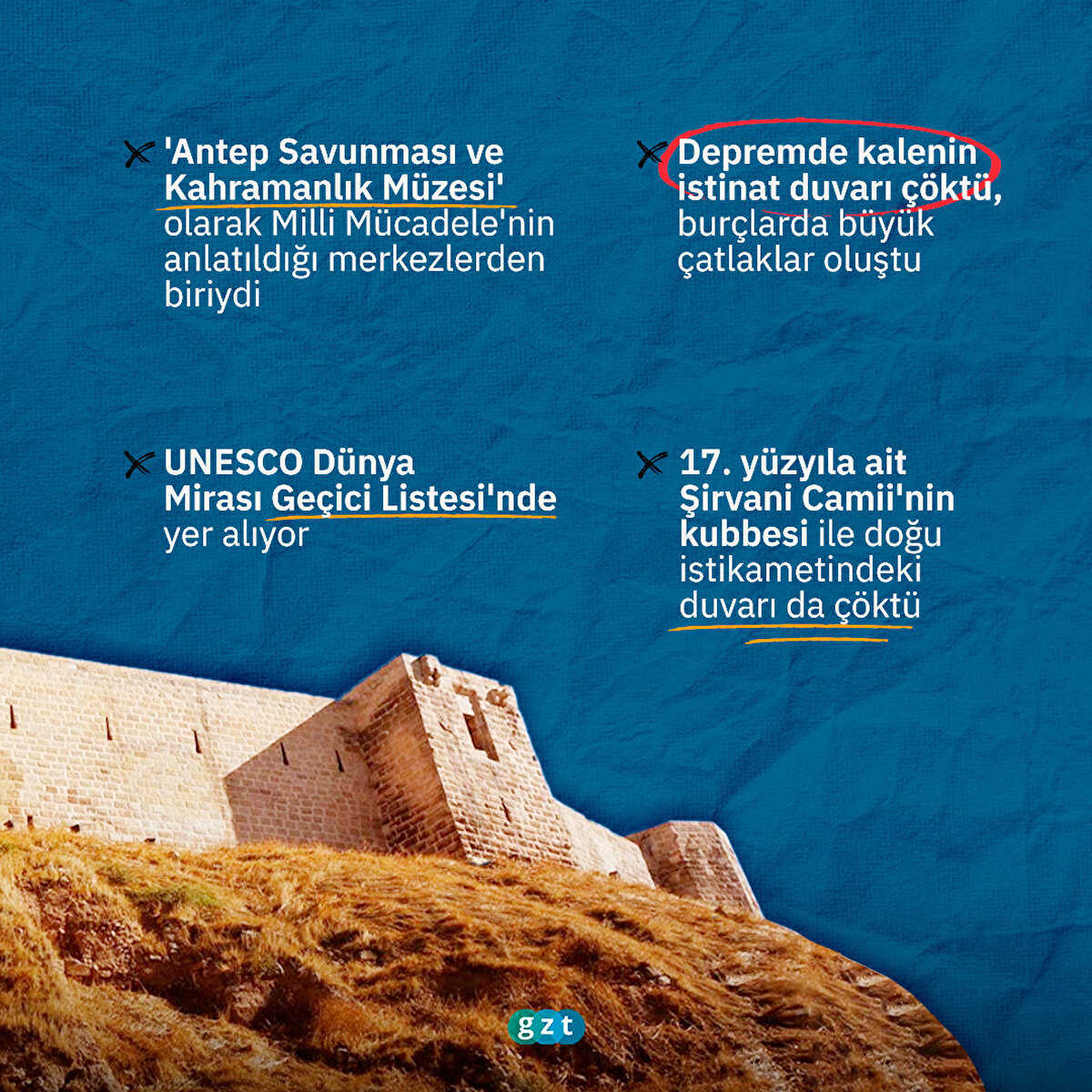 Kurtuluş Savaşı sırasında kadınların ve çocukların sığınağı olan, Antep savunmasının simgesi olarak bilinen Gaziantep Kalesi, Unesco Dünya Mirası Geçici Listesi'nde yer alıyor. Kahramanmaraş'taki 7.4 büyüklüğündeki depremde kale büyük ölçüde yıkıldı.17. yüzyıla ait Şirvani Camii'nin kubbesi ile doğu istikametindeki duvarı da çöktü