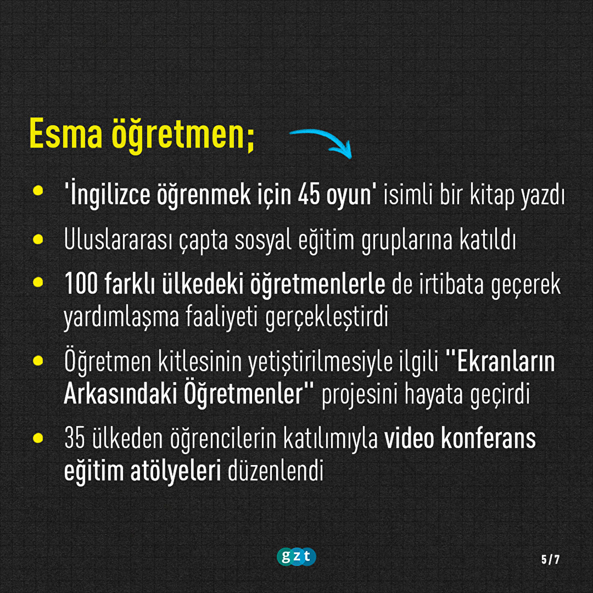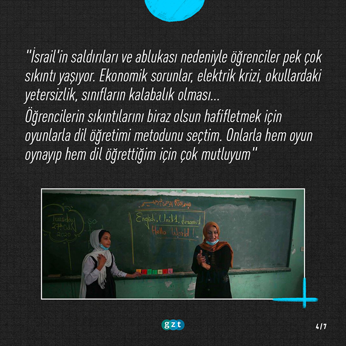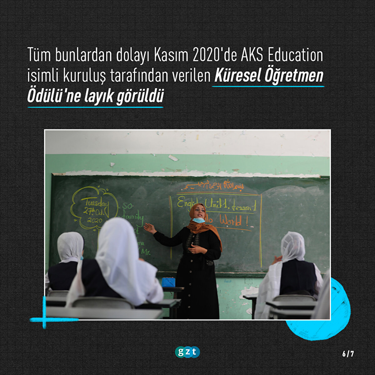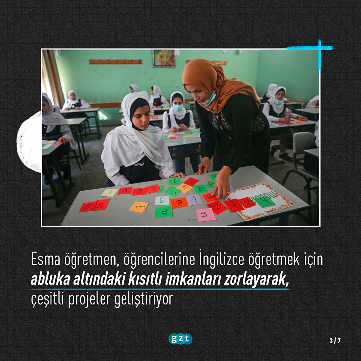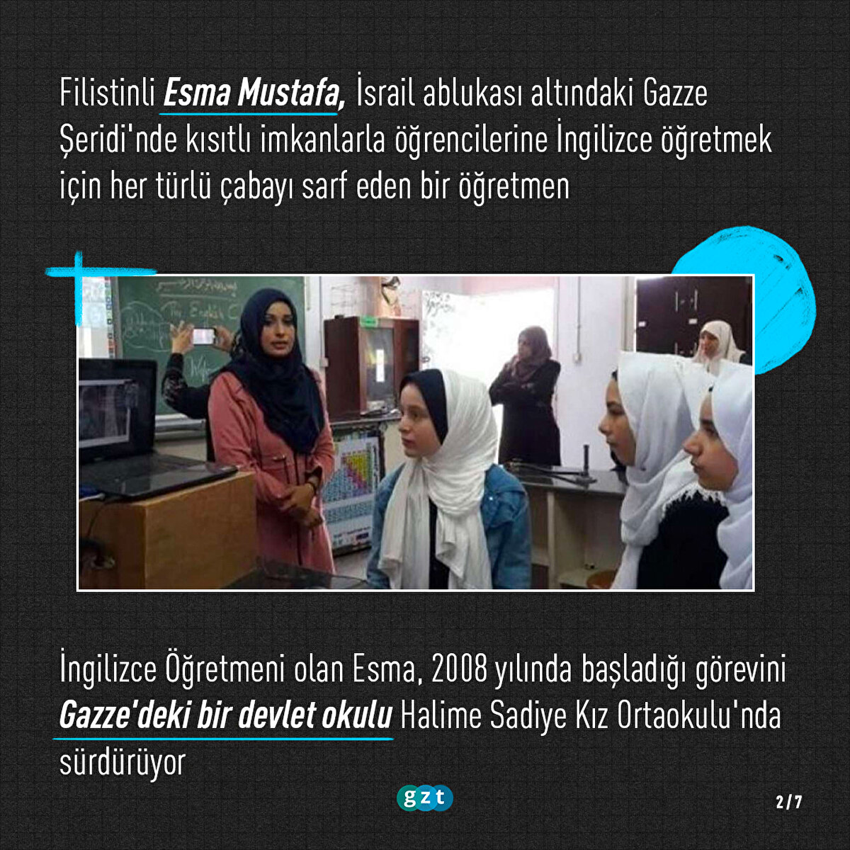 Gazze Eğitim Müdürlüğü'ne bağlı Halime Sa'diyye Kızlar Okulu'nda İngilizce öğretmenliği yapan Esma Mustafa adlı öğretmen, Hindistan'daki AKS Education Award kurumu tarafından verilen Küresel Öğretmen Ödülü'nü almaya hak kazanmıştı. Esma öğretmen Gazzeli çocuklar eğitimden geri kalmasın diye birçok çaba sarf etti. 'İngilizce öğrenmek için 45 oyun' kitabını yazdı, farklı ülkelerden 35 çocuğa ders verdi ve çok daha fazlası. Öğretmenler gününde Esma öğretmeni sevgiyle anıyoruz.