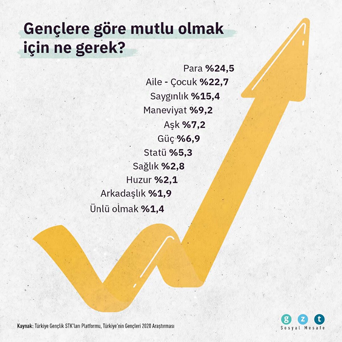 Türkiye Gençlik STK'ları Platformu'nun 8 bin denekle yaptığı “Türkiye'nin Gençleri 2020 Araştırması'nın sonuçları yayımlandı. Buna göre gençlerin ekseriyeti mutlu olmak için para sahibi olmak gerektiğini ifade etti. Parayı aile yaşantısı ve saygınlık takip ederken, tanınırlık ve ünlü olmak ise listenin sonunda yer aldı