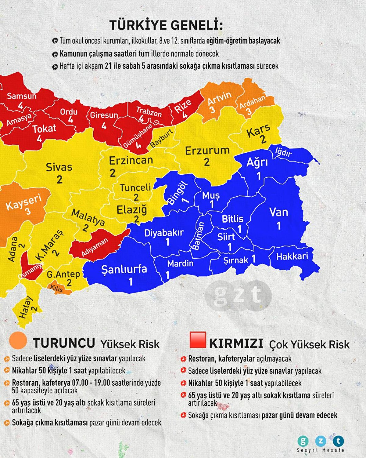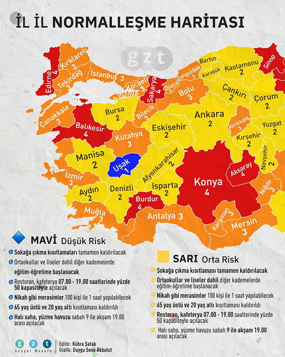 Türkiye'de kademeli normalleşme süreci başlıyor. İller risk değerlendirme kriterlerine göre 4 kategoriye ayrıldı. Mavi düşük risk, sarı orta risk, turuncu yüksek risk ve kırmızı çok yüksek risk olarak illerin normalleşme haritasını sizin için hazırladık.