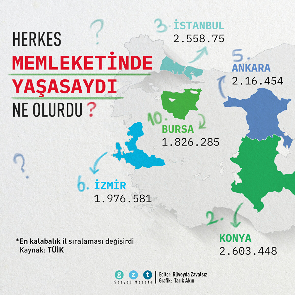 84 milyonluk nüfusa sahip olan Türkiye'de en kalabalık nüfus İstanbul, Ankara ve İzmir'de bulunuyor. Ancak Türkiye'de kütüğe göre bir nüfus haritası olması durumunda, ortaya çok farklı bir durum çıkıyor. Buna göre, Şanlıurfa en kalabalık şehir olurken, onu sırasıyla Konya, İstanbul, Diyarbakır, Ankara, İzmir, Samsun, Sivas, Erzurum ve Bursa takip etti.