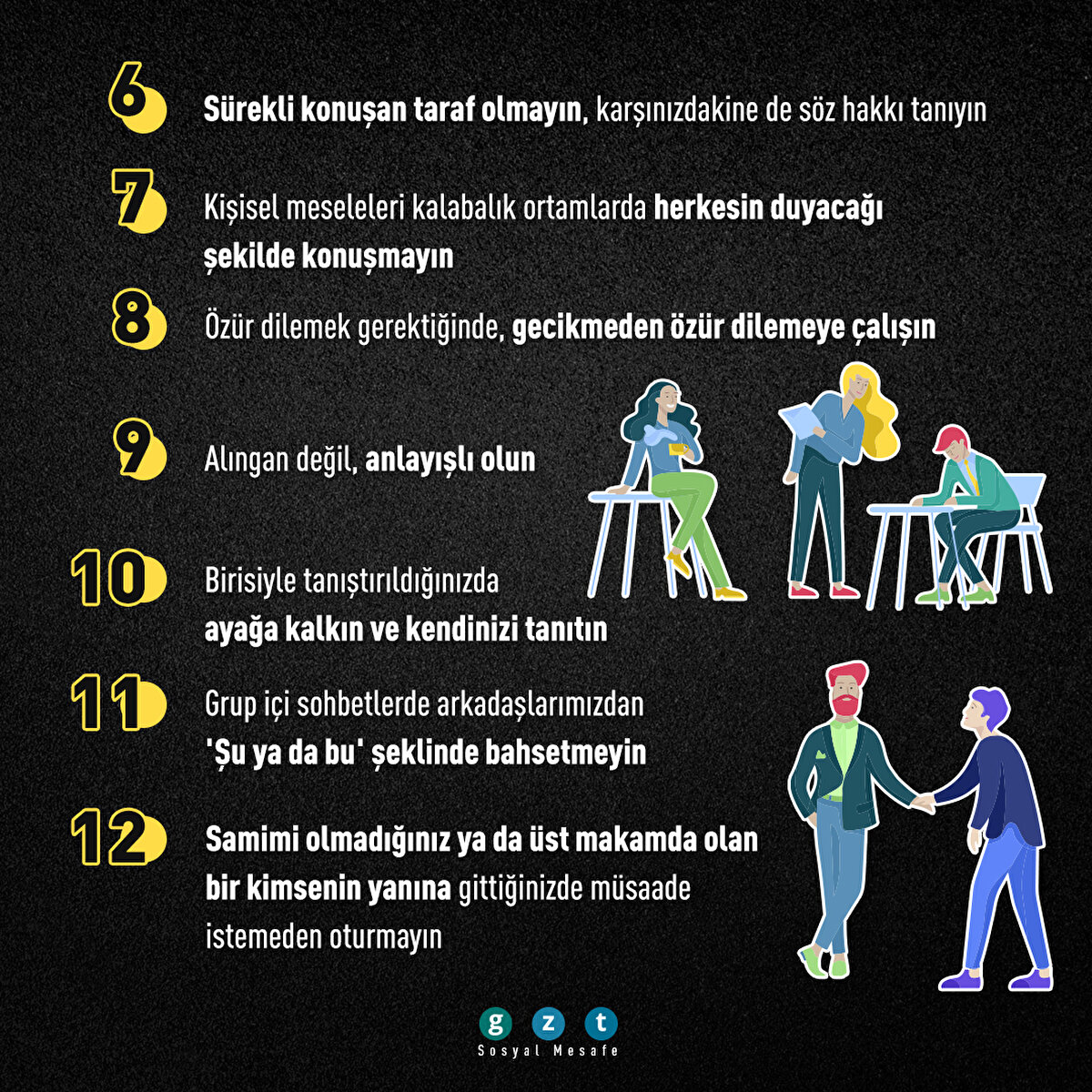1- Herkesin içinde konuşamayacağınızı özelde de konuşmayın 2- Özelde konuştuğunuzu herkesin içinde afişe etmeyin 3- Her doğru her yerde söylenmez ama her söylediğiniz doğru olsun 4- 'Teşekkür ederim' ve 'lütfen' kelimelerini kullanmaya çalışın 5- Konuşurken sürekli kendinizden bahsetmeyin 6- Sürekli konuşan taraf olmayın, karşınızdakine de söz hakkı tanıyın 7- Kişisel meseleleri kalabalık ortamlarda herkesin duyacağı şekilde konuşmayın 8- Özür dilemek gerektiğinde, gecikmeden özür dilemeye çalışın 9- Alıngan değil, anlayışlı olun 10- Birisiyle tanıştırıldığınızda ayağa kalkın ve kendinizi tanıtın 11- Grup içi sohbetlerde arkadaşlarımızdan 'Şu ya da bu' şeklinde bahsetmemeliyiz 12- Samimi olmadığınız ya da üst makamda olan bir kimsenin yanına gittiğinizde müsaade istemeden oturmayın