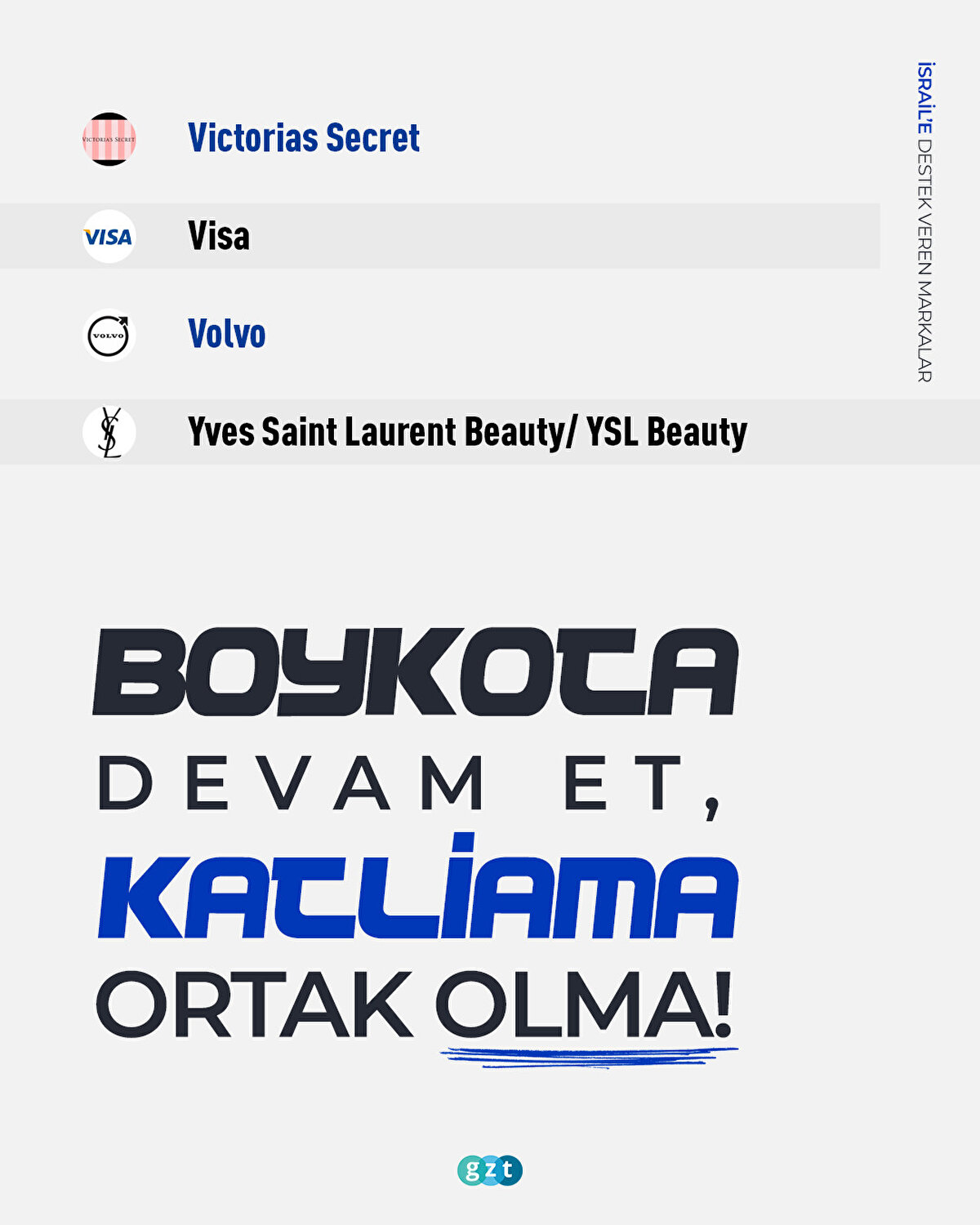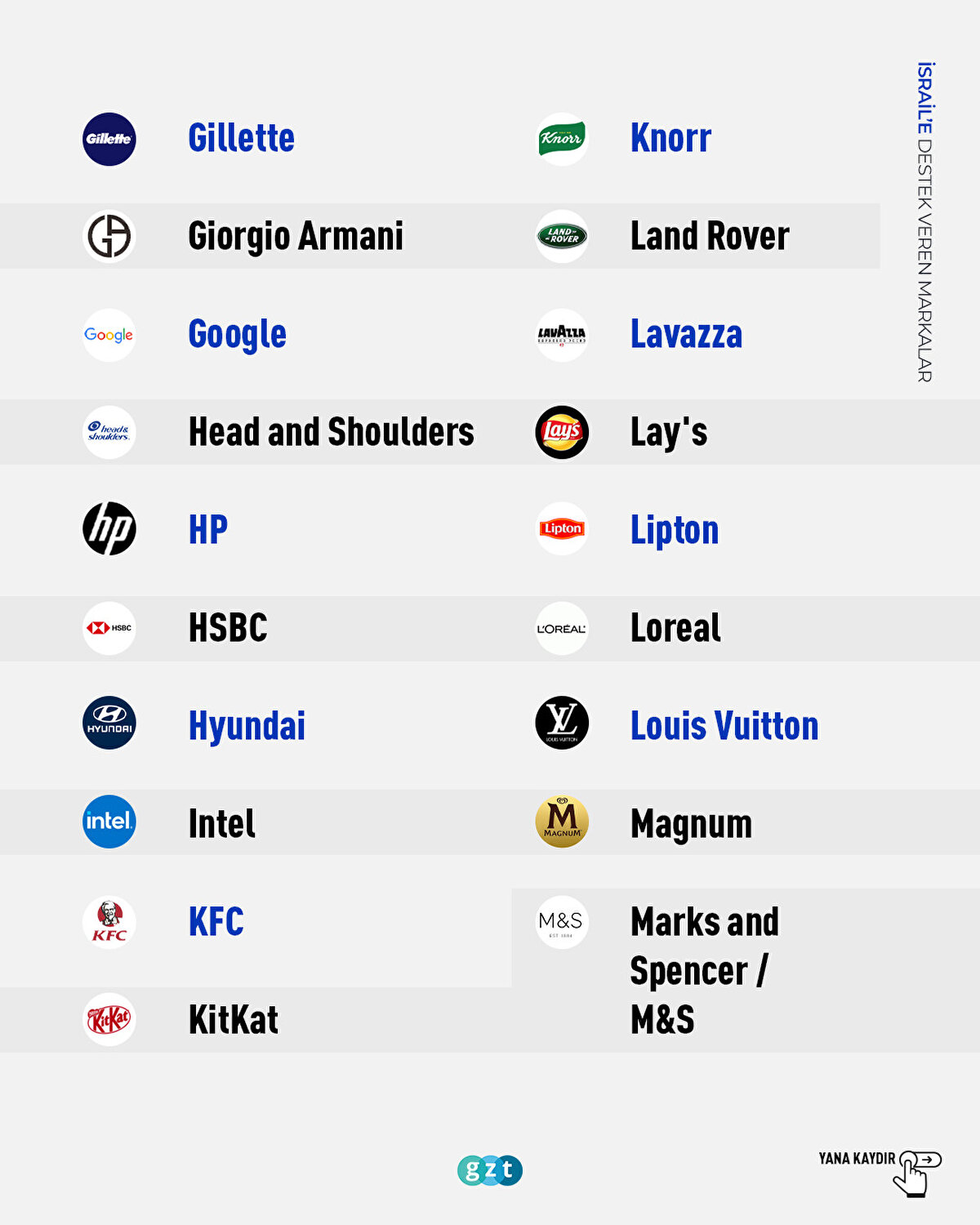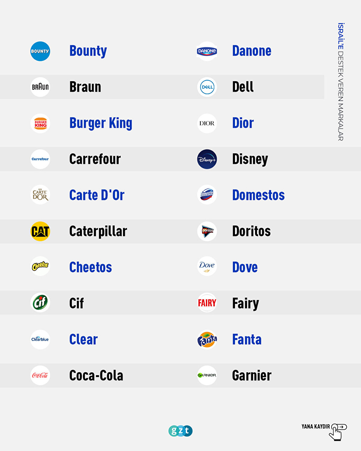İsrail'in Filistin'in Gazze şehrinde sivillere yönelik saldırıları İslam dünyasında büyük tepkilere yol açtı. İsrail ürünlerini ve markalarını boykot etmek isteyen birçok vatandaş 'İsrail ürünleri ve malları neler?, Hangi markalar İsrail'e ait?' sorularını sormaya başladı. Gıdadan, temizlik malzemelerine, içecekten giyim sektörüne kadar İsrail'e desteğini açıklayan ve boykot edilen markaların listesini hazırladık