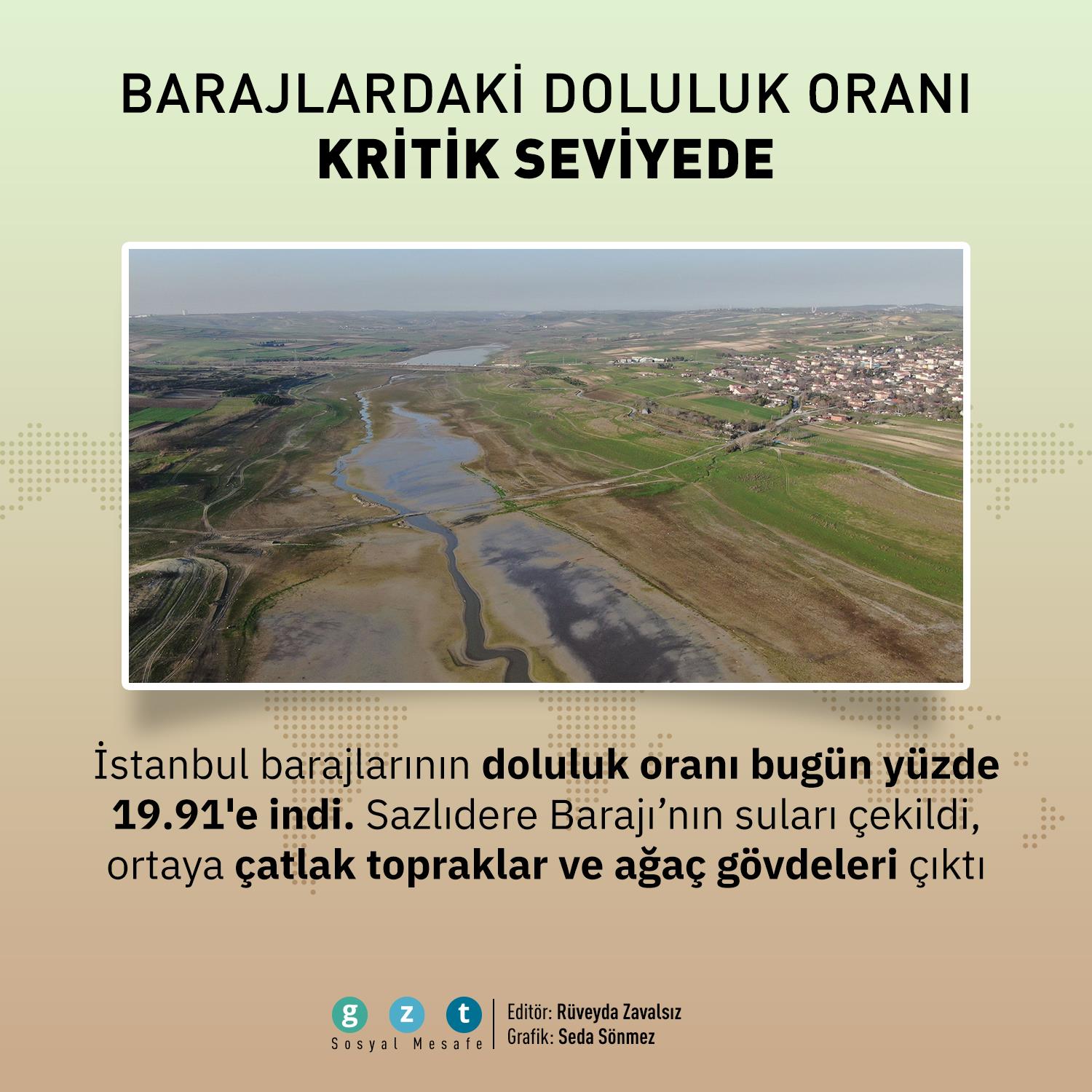 Sonbahar ve kış aylarının yağışsız geçmesi nedeniyle İstanbul barajlarındaki doluluk oranı kritik seviyede. İSKİ verilerine göre İstanbul barajlarının doluluk oranı bugün 19.91'e indi. Yani İstanbul'un içme suyu kaynaklarının yüzde 80'den fazlası boş durumda. Sazlıdere Barajının çekilen suları havadan da fotoğraflandı.