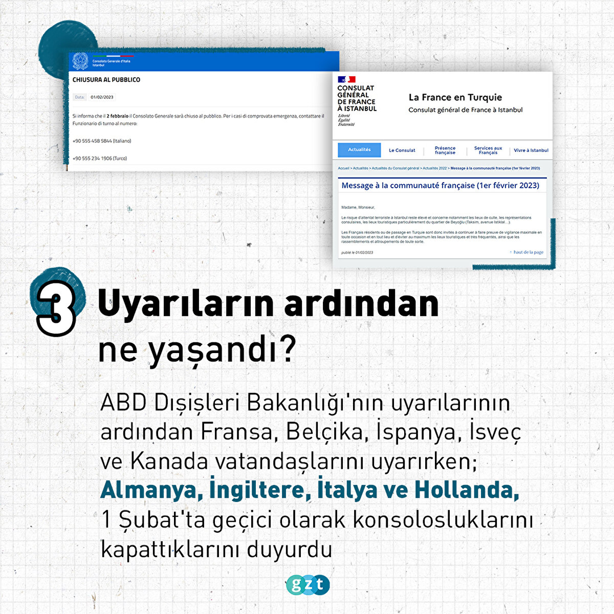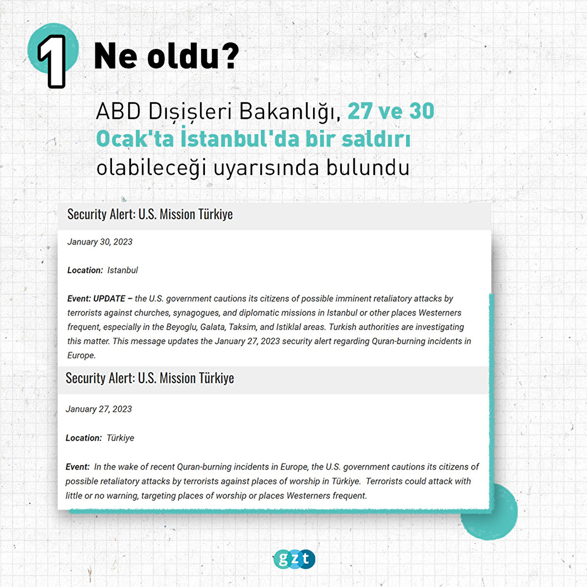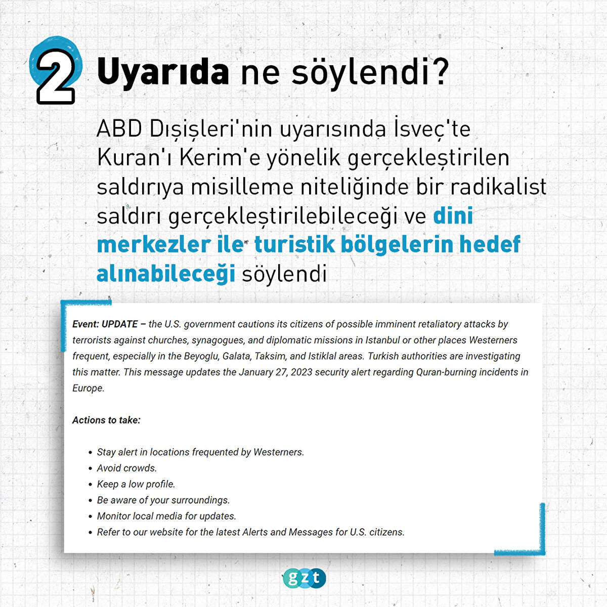 ABD yönetimi 29 Ocak'ta Türkiye'ye dönük güvenlik uyarısı yayınlamış, Kur'an-ı Kerim'i yakma eylemine karşı İstiklal Caddesi, Galata, Beyoğlu bölgesinde kiliselere, sinagoglara ve diplomatik misyonlara misilleme saldırıları yapılabileceği konusunda uyarmıştı. ABD Dışişleri Bakanlığı'nın uyarılarının ardından Fransa, Belçika, İspanya, İsveç ve Kanada vatandaşlarını uyarırken; Almanya, İngiltere, İtalya ve Hollanda, 1 Şubat'ta geçici olarak konsolosluklarını kapattıklarını duyurdu.