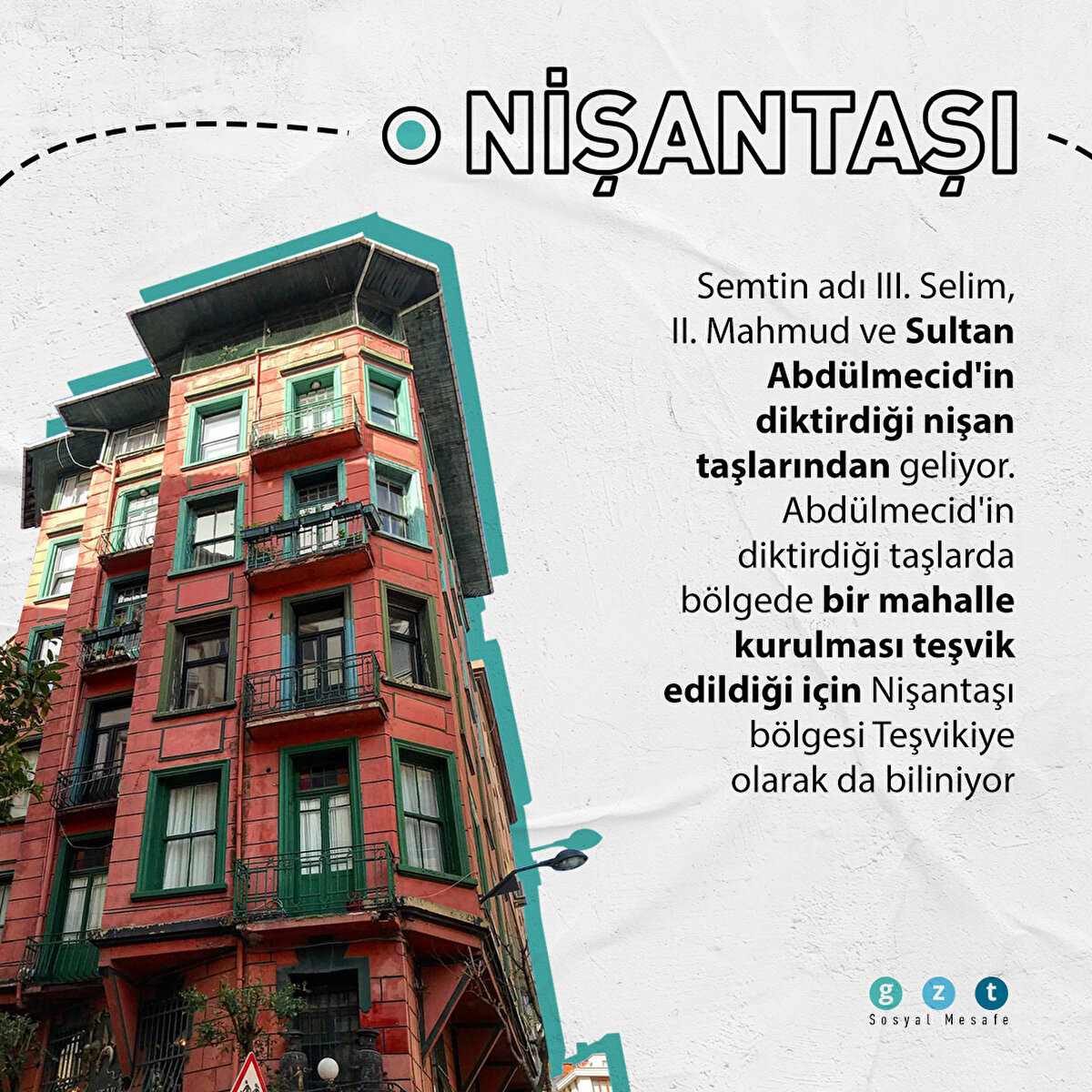NİŞANTAŞI Semtin adı III. Selim, II. Mahmud ve Sultan Abdülmecid'in diktirdiği nişan taşlarından geliyor. Abdülmecid'in diktirdiği taşlarda bölgede bir mahalle kurulması teşvik edildiği için Nişantaşı bölgesi Teşvikiye olarak da biliniyor