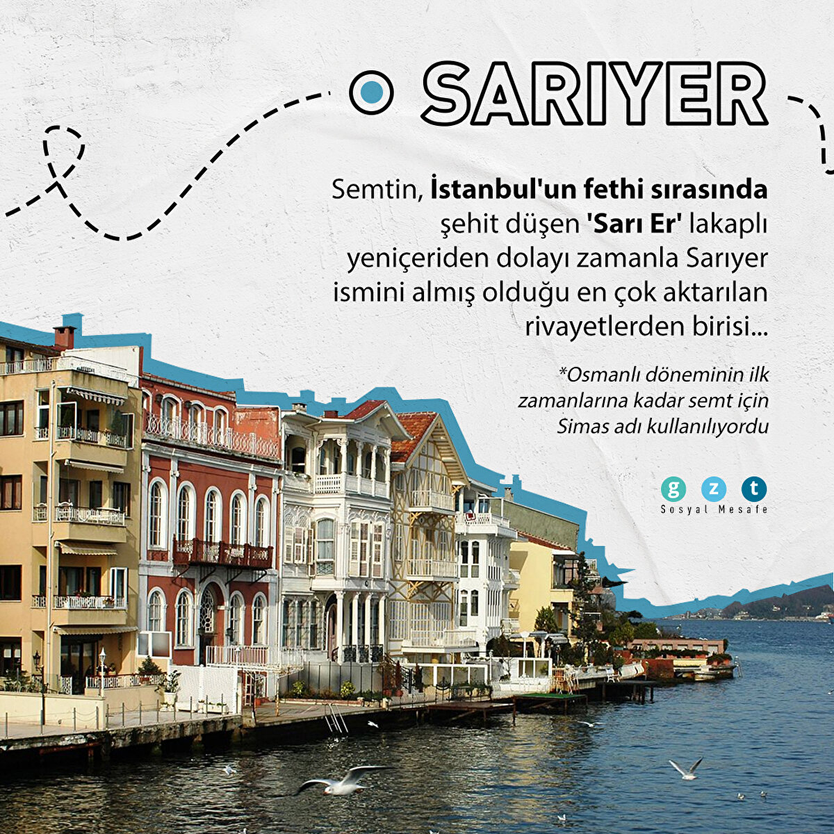 SARIYER Semtin, İstanbul'un fethi sırasında şehit düşen 'Sarı Er' lakaplı yeniçeriden dolayı zamanla Sarıyer ismini almış olduğu en çok aktarılan rivayetlerden birisi... *Osmanlı döneminin ilk zamanlarına kadar semt için Simas adı kullanılıyordu