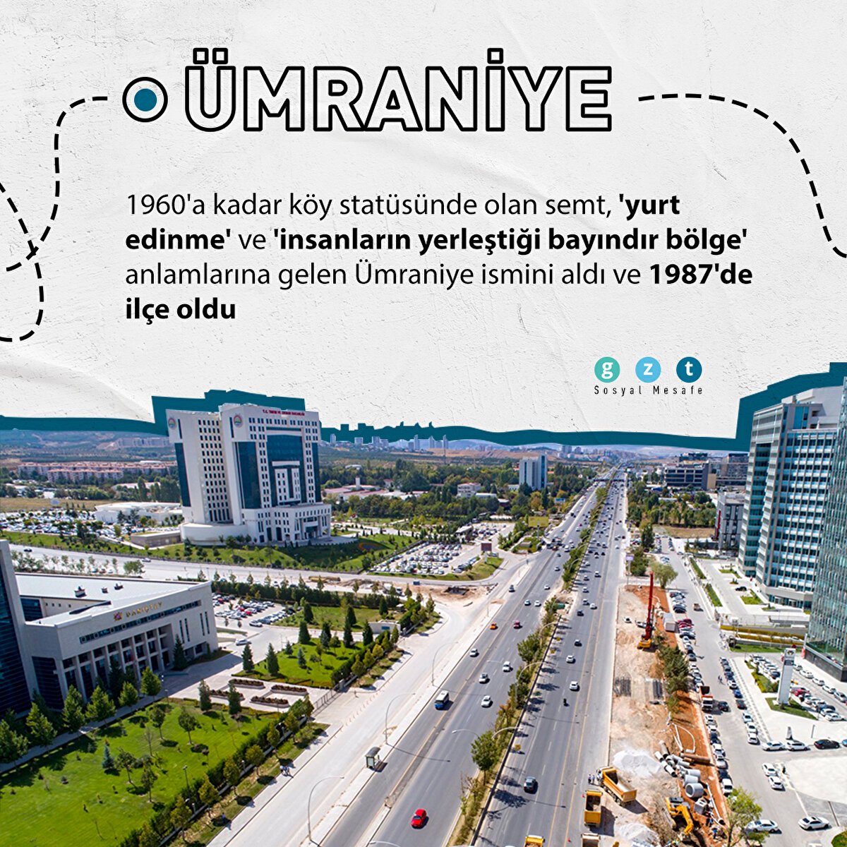 ÜMRANİYE 1960'a kadar köy statüsünde olan semt, 'yurt edinme' ve 'insanların yerleştiği bayındır bölge' anlamlarına gelen Ümraniye ismini aldı ve 1987'de ilçe oldu