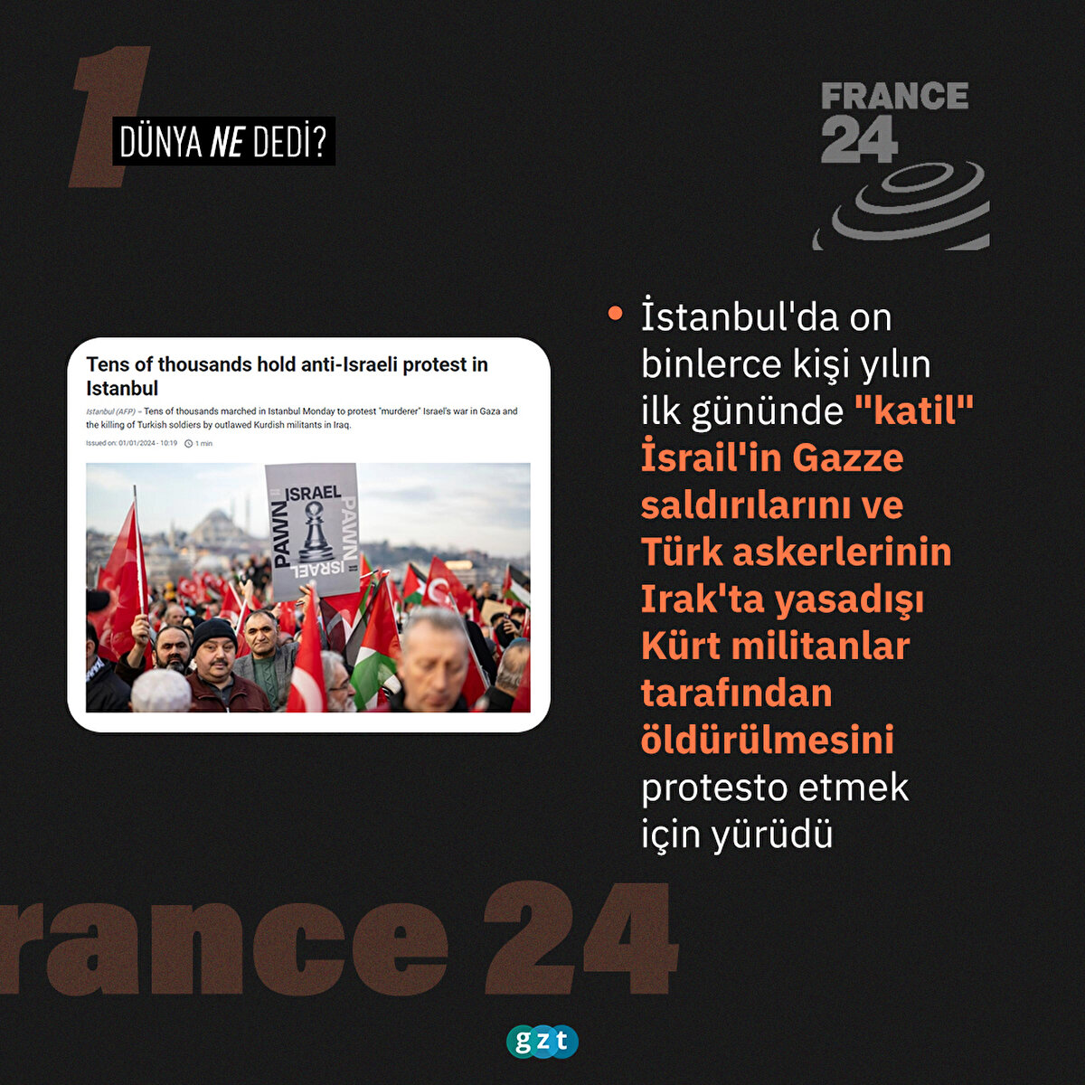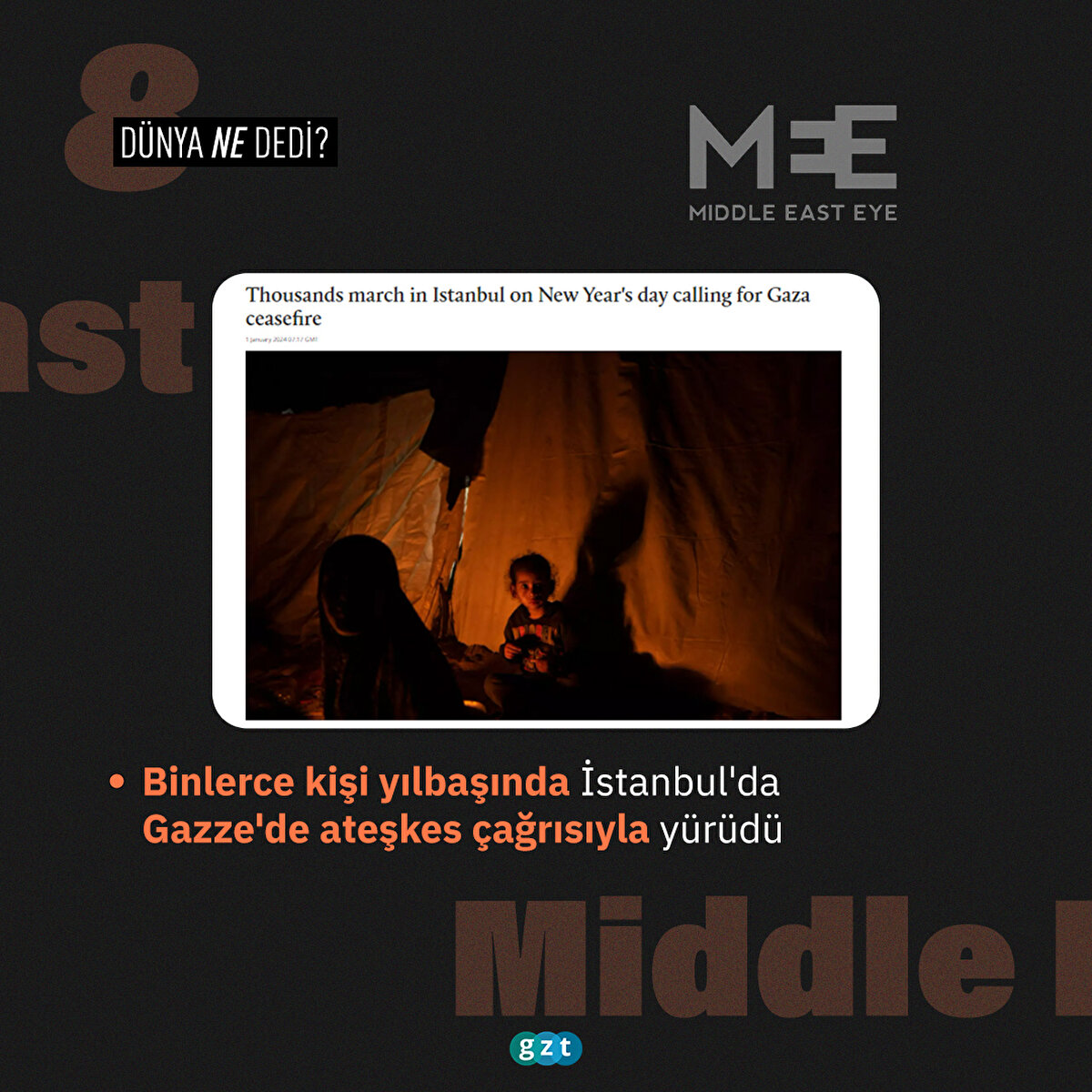 İngiltere merkezli Middle East Eye "Binlerce kişi yılbaşında İstanbul'da Gazze'de ateşkes çağrısıyla yürüdü" başlığını kullandı.