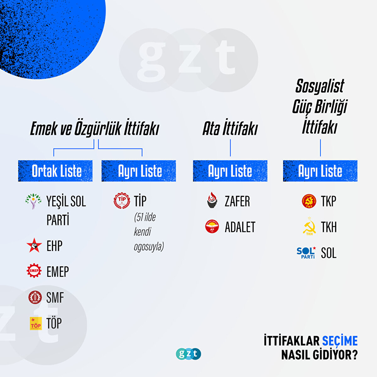 Yüksek Seçim Kurulu (YSK), 14 Mayıs'ta yapılacak 28. Dönem Milletvekili Genel Seçimi'ne, 36 siyasi partinin katılma yeterliliğine sahip olduğunu tespit etti, bunlardan 26'sı milletvekili geçici aday listelerini YSK'ya sundu. 28. Dönem Parlamentosu'nu belirlemek için 14 Mayıs'ta yapılacak seçime milletvekili geçici aday listesi veren 26 partiden 13'ü tek başına, 13'ü ise ittifaklar adı altında girecek.