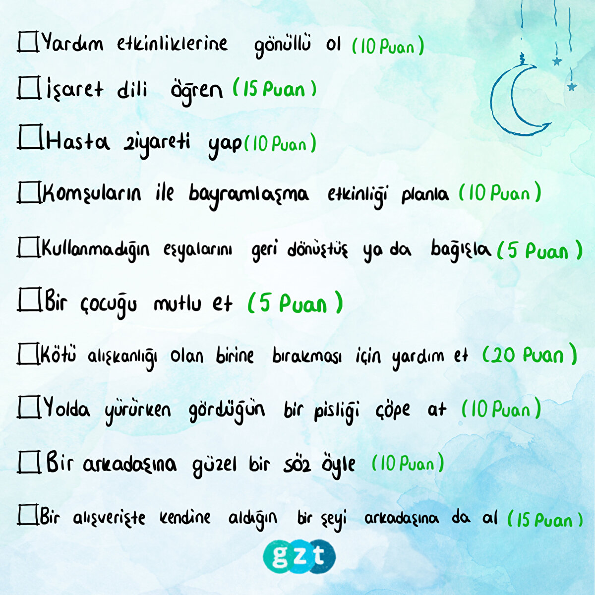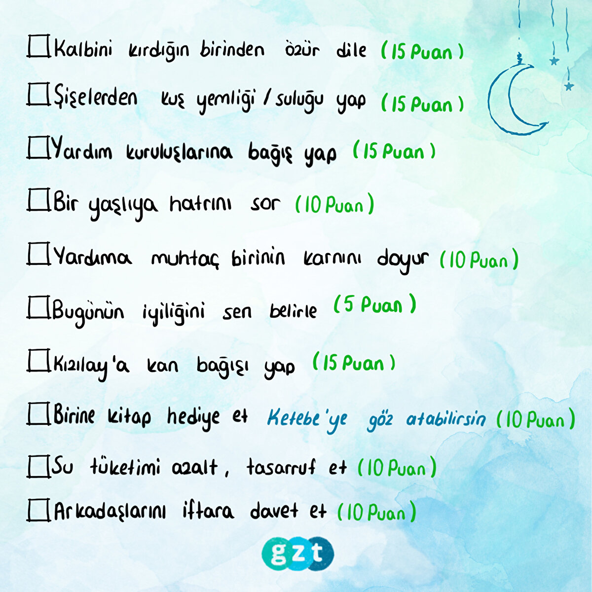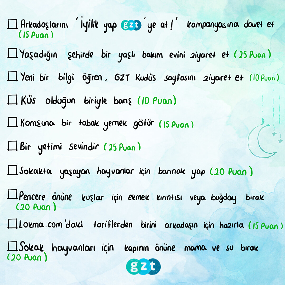 GZT sizler için Ramazan ayı boyunca her gün yapabileceğiniz bir iyilik listesi hazırladı. Siz iyilik yapın, yaptığınız iyiliklerden topladığınız puanla adınıza fidan dikelim.