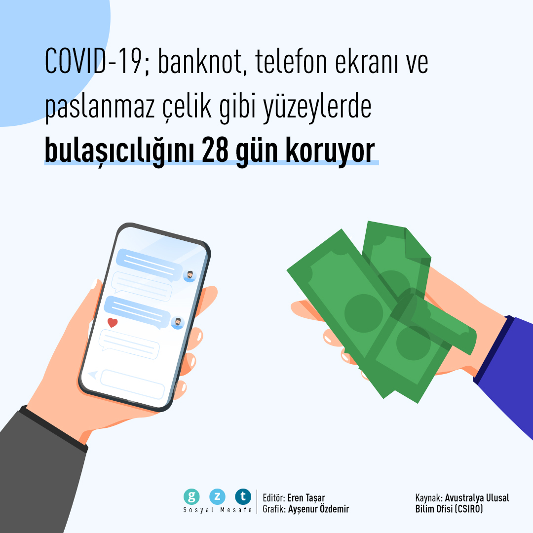 Avustralya'da yapılan bir araştırma, COVID-19 hastalığına neden olan virüsün, kağıt para, telefon ekranı ve paslanmaz çelik ürünler üzerinde 28 gün bulaşıcılığını koruyabildiğini ortaya koydu.