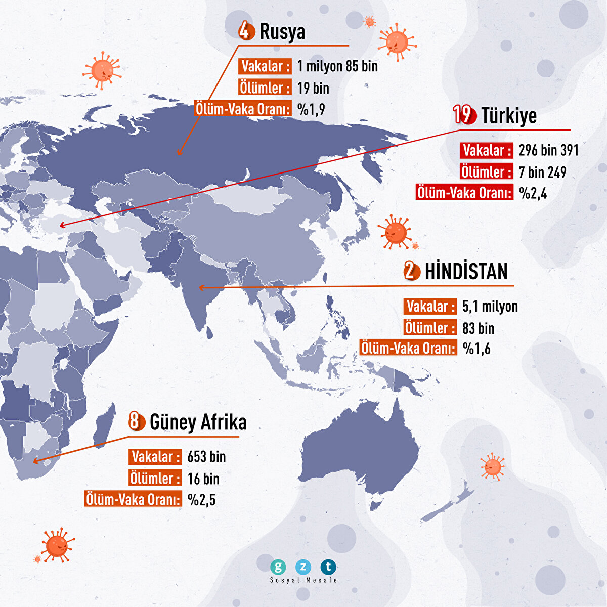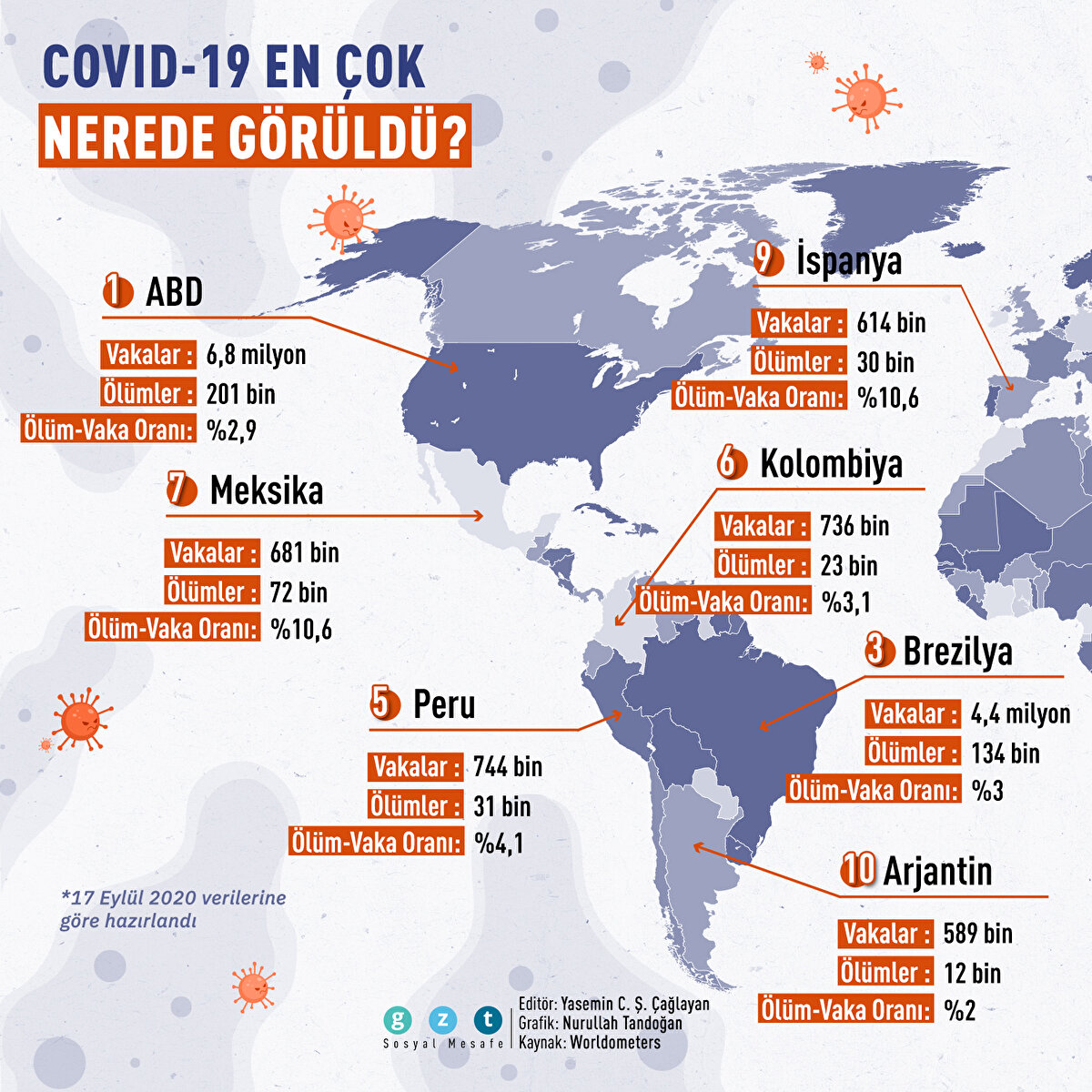 Dünyadaki toplam vaka sayısı 30 milyonu aşarken, 945 bin kişi hayatını kaybetti. Koronavirüs vakalarının en görüldüğü ülkelere baktığımızda ise Latin Amerika ülkeleri dikkati çekiyor. Öte yanda Türkiye, toplam vaka sayısı göz önüne alındığında dünyada 19'uncu sırada yer alıyor.
