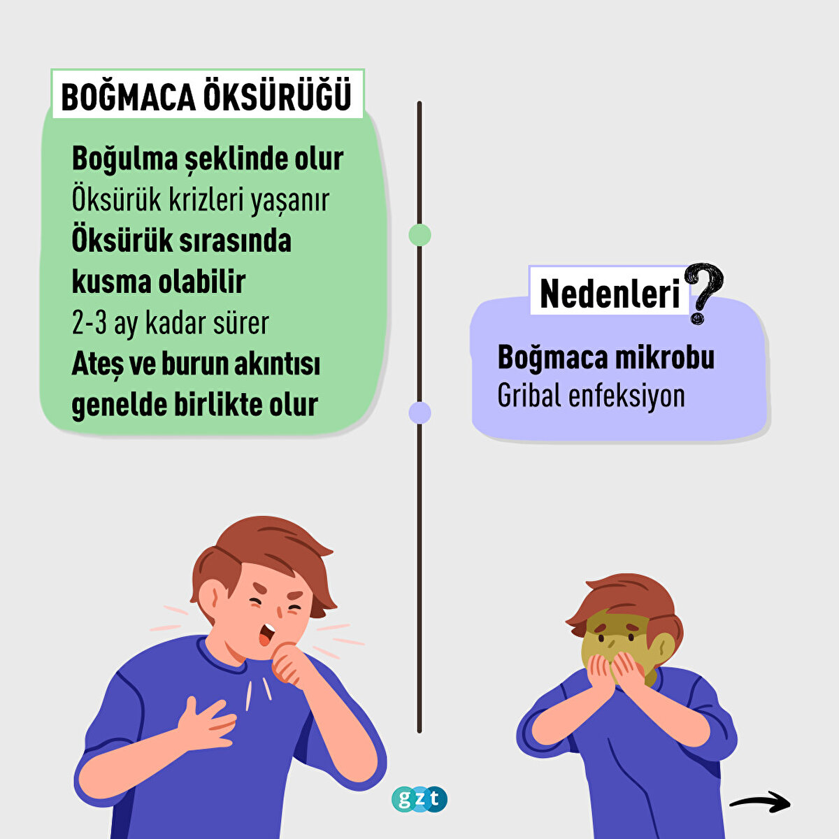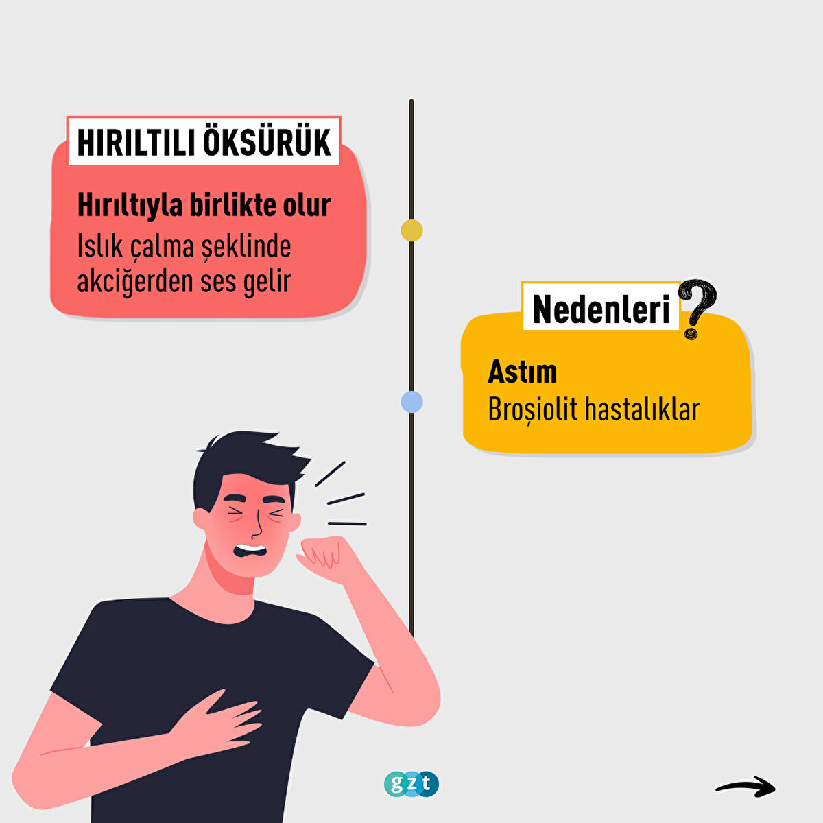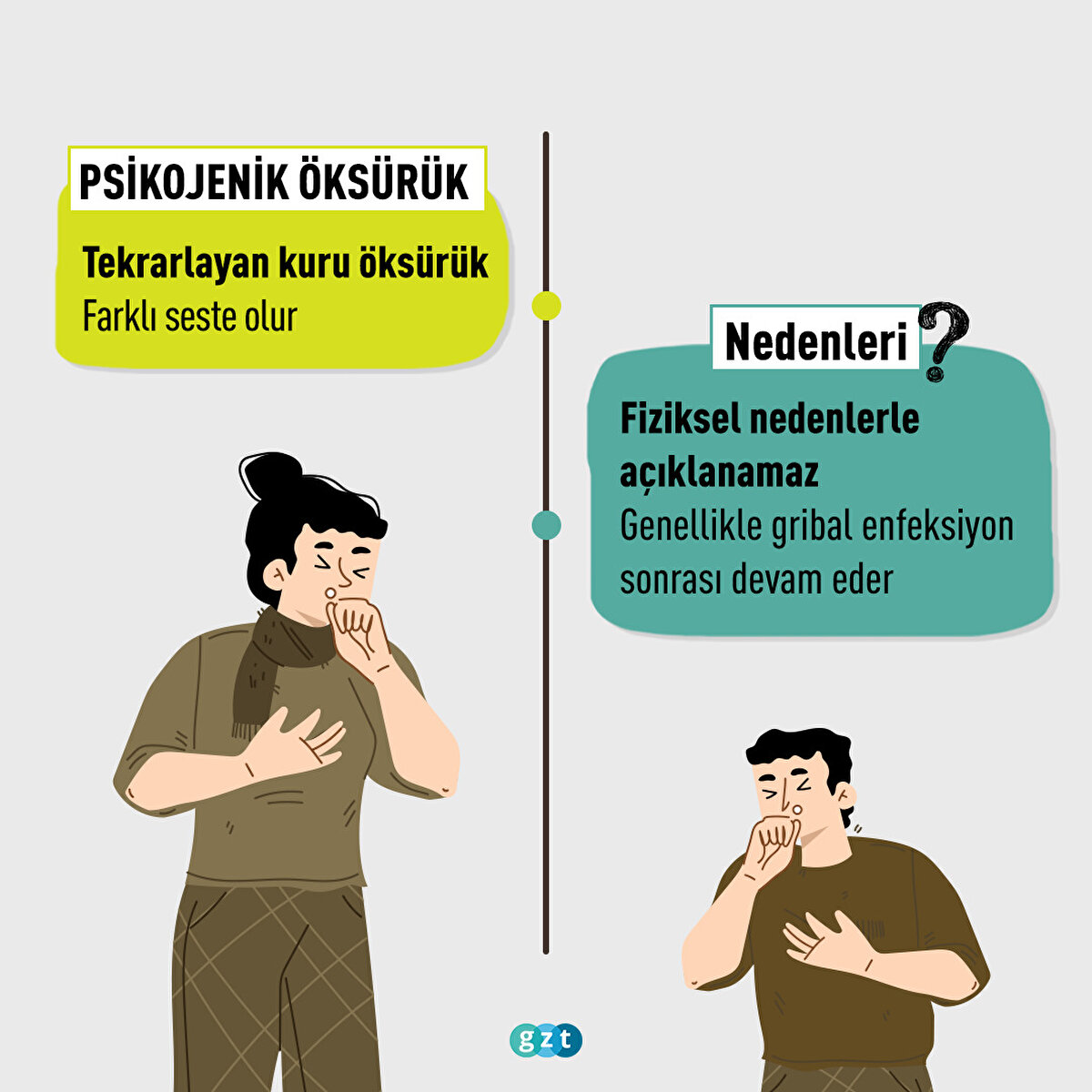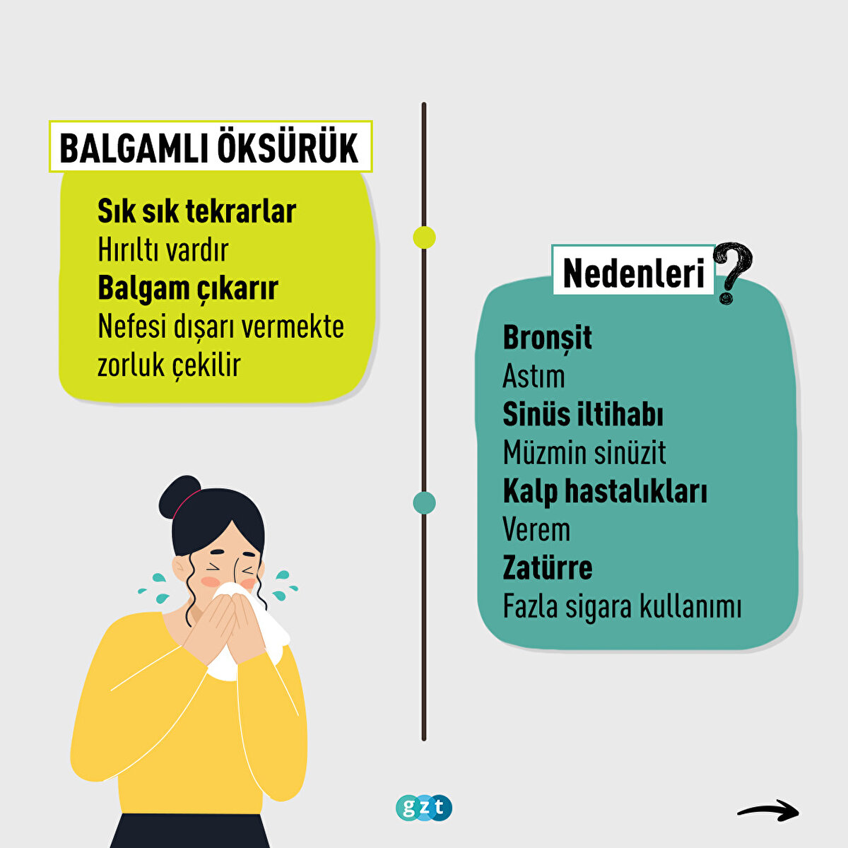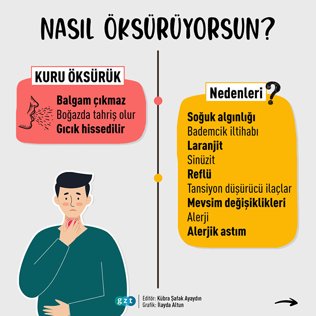 Bugünlerde çevrenizde öksüren sayısının giderek arttığını fark etmişsinizdir. Siz de öksürenlerden biri olabilirsiniz. Öksürüğün pek çok nedeni olabilir. Nezle ve grip, farenjit, astım, geniz akıntısı, reflü, kalp yetmezliği, tüberküloz, akciğerde sıvı toplanması gibi hastalıklar kuru öksürüğe neden olabilir. Öksürüğün en yaygın nedeni, öksürüğün soğuk algınlığının, Covid-19'un veya gribin bir parçası olduğu viral enfeksiyondur. Sinüzit, bronşit veya sigara içimi ise balgamlı öksürüğe yol açabilir. Ayrıca; kronik kulak problemleri, uzun süre kullanılan tansiyon ilaçları ve sigara da öksürük nedenleri arasındadır. Zaman zaman öksürüğün nedeni psikolojik de olabilir. Öksürük çeşitlerini sizin için derledik.
