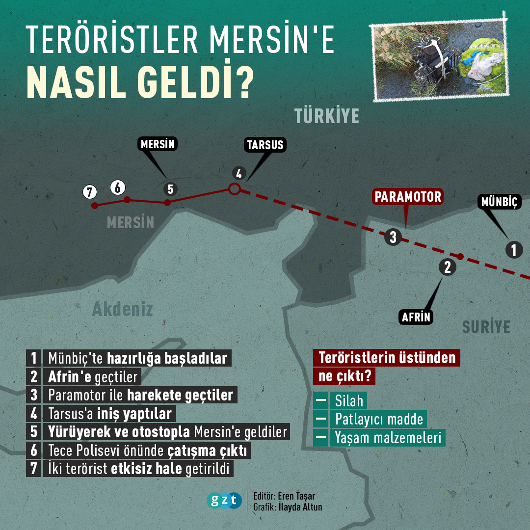 "Bu eylemi gerçekleştirenler, Münbiç'ten hareket ettiler. Eylemden önceki akşam saat 20.00 itibarıyla tam 12-13 saat paramotorla Tarsus'a geldiler. Tarsus'ta kıyıya yakın bir yere indiler, sabah saat 10.00'a doğru. Akşama kadar orada kaldılar ve oradan yürüyerek sonra birilerinin arabalarına binerek, normal vatandaşların, onlar da insaniyet namına götürmüşler ve ondan sonra eylemi gerçekleştirdiler."