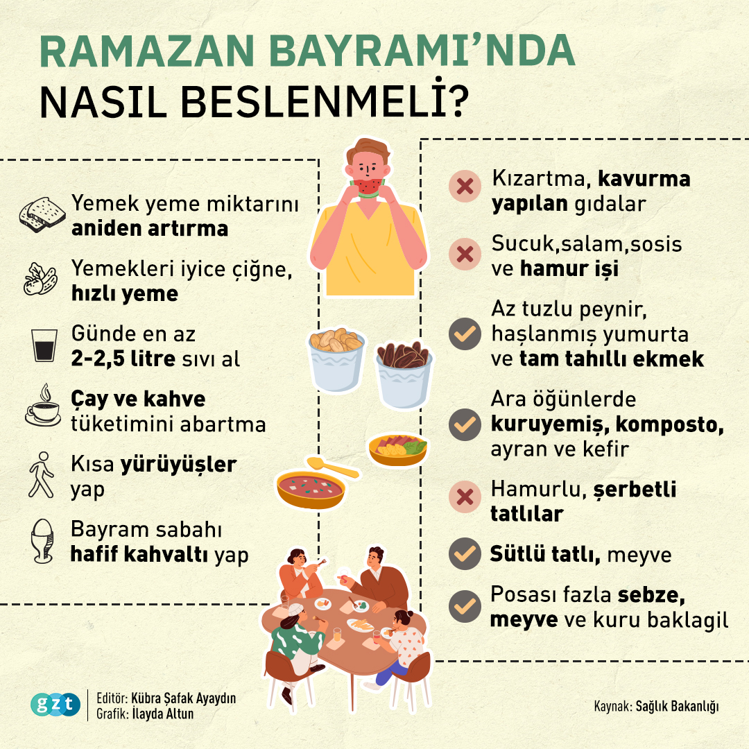 Ramazan ayında uzun saatler tutulan orucun ardından bayramlarda genellikle yemek yeme abartılıyor ancak sonrasında rahatsızlar da kaçınılmaz oluyor. Bu rahatsızlıkları yaşamamanız için Sağlık Bakanlığı'nın önerilerini tek tek sıraladık.