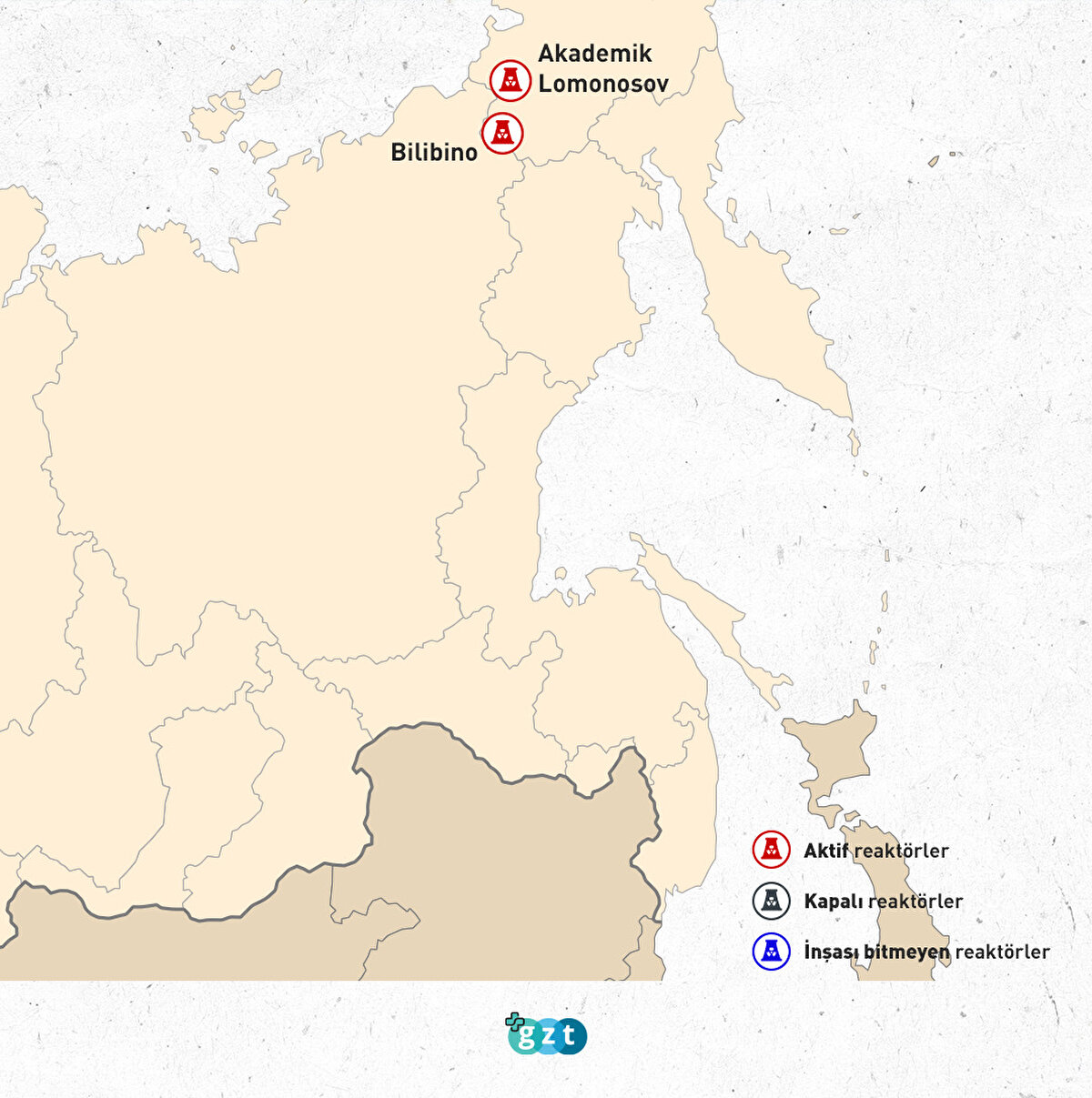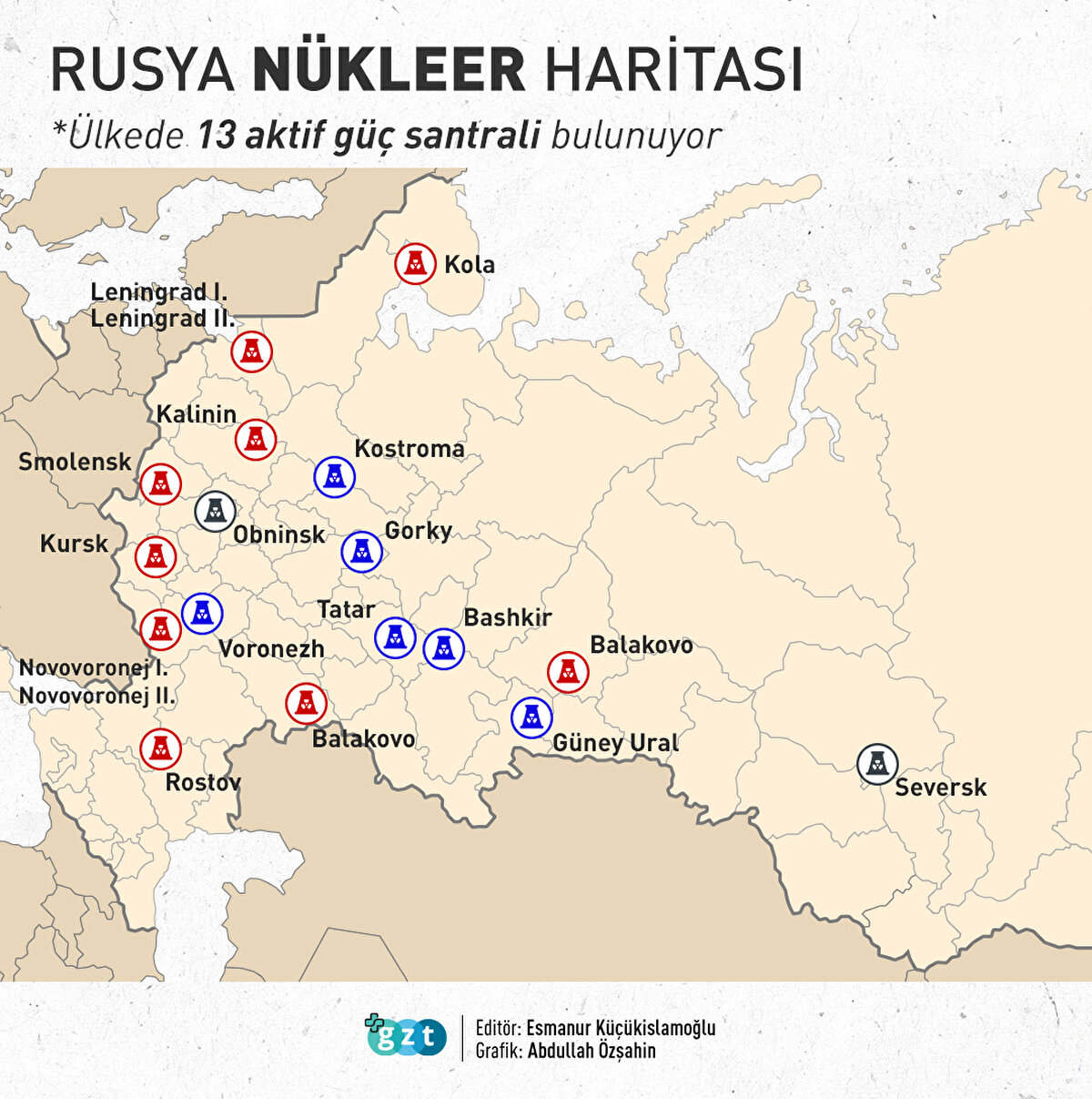 Rusya'da 13 aktif, 2 kapalı, 6 adet de inşası bitmemiş reaktör bulunuyor.