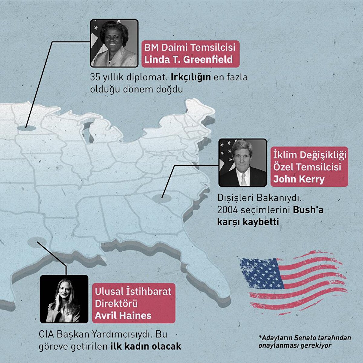 ABD Başkanı Donald Trump'ın beyaz ve erkek ağırlıklı kabinesinden "farklı" olacağı tahmin edilen Joe Biden kabinesinde çok sayıda kadın yer alacak. Ayrıca, kabinenin Obama dönemi bürokratlarından olması dikkati çekiyor.