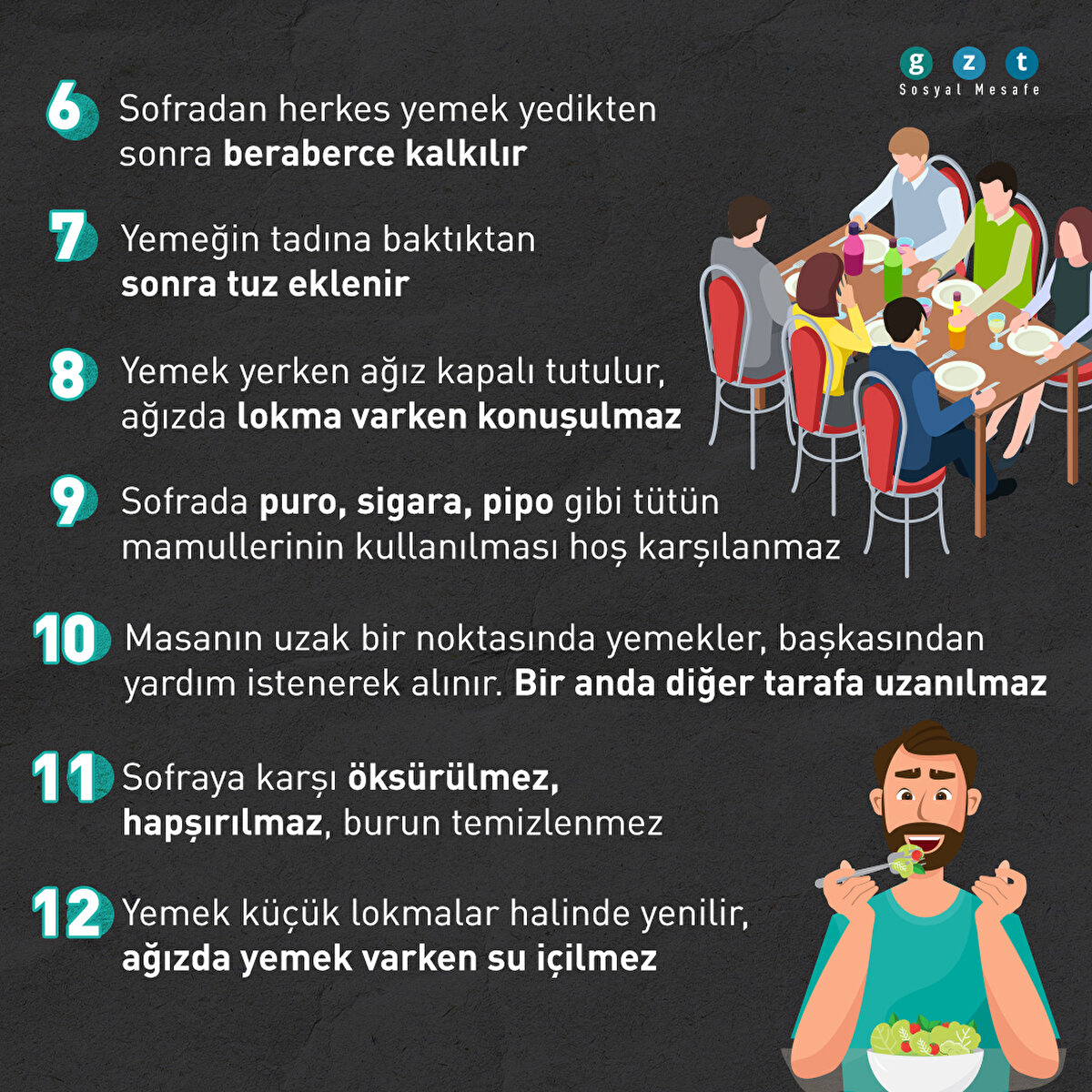 1- Yemek sırasında kullanılan çatal ve bıçak kullanıldıktan sonra tabağa konulur 2- Ev sahibi ya da davetteki en büyük kişi sofraya oturmadan masaya oturulmaz 3- Dirseklerin masaya konulması, yayılarak oturmak ve kolların masayı kaplaması saygısızlık olarak algılanır 4- Tabağa çok fazla yemek doldurulmaz. Eğer doyulmazsa sonradan ekleme yapılır 5- Çorbaya ya da salataya limon sıkılacağı zaman, limon bir elle siper edilir ve sıçraması önlenir 6- Sofradan herkes yemek yedikten sonra beraberce kalkılır 7- Yemeğin tadına baktıktan sonra tuz eklenir 8- Yemek yerken ağız kapalı tutulur, ağızda lokma varken konuşulmaz 9- Sofrada puro, sigara, pipo gibi tütün mamullerinin kullanılması hoş karşılanmaz 10- Sofraya karşı öksürülmez, hapşırılmaz, burun temizlenmez 11- Masanın uzak bir noktasında yemekler, başkasından yardım istenerek alınır. Bir anda diğer tarafa uzanılmaz 12- Yemek küçük lokmalar halinde yenilir, ağızda yemek varken su içilmez