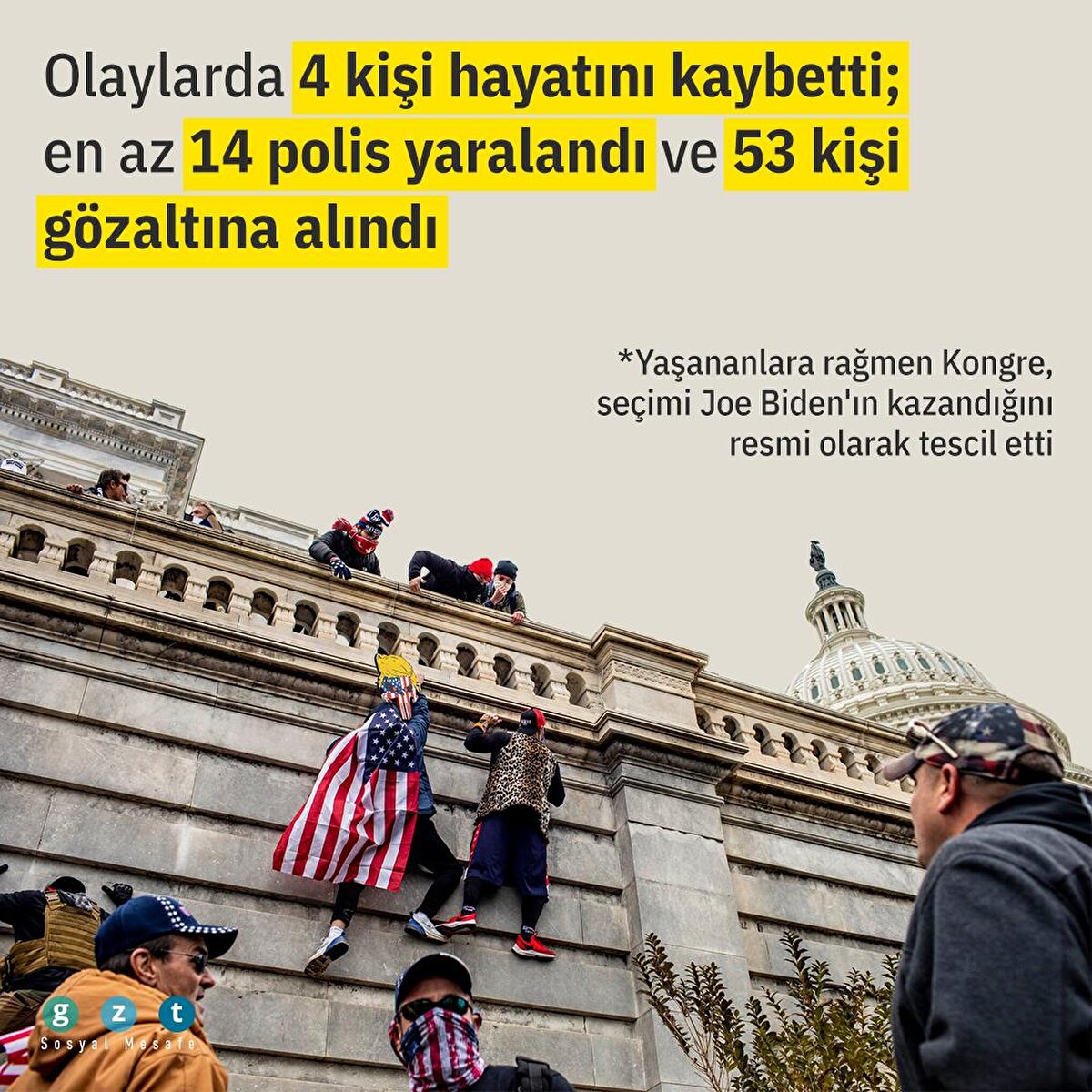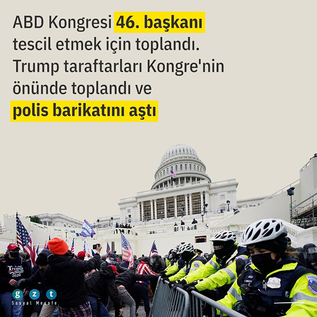 ABD'de 3 Kasım seçimlerinin Kongre tarafından Joe Biden lehine tescil edileceği gün binlerce Trump taraftarı Kongre binasını bastı. Yaşanan olaylarda 4 kişi hayatını kaybetti ancak tüm bunlara rağmen tescil işlemi tamamlandı.