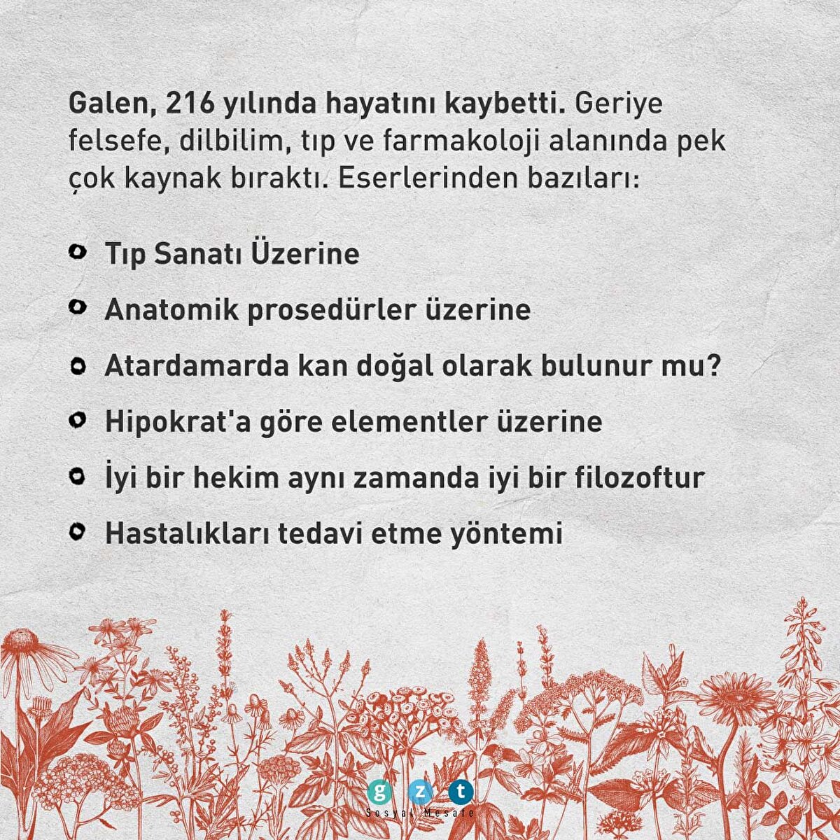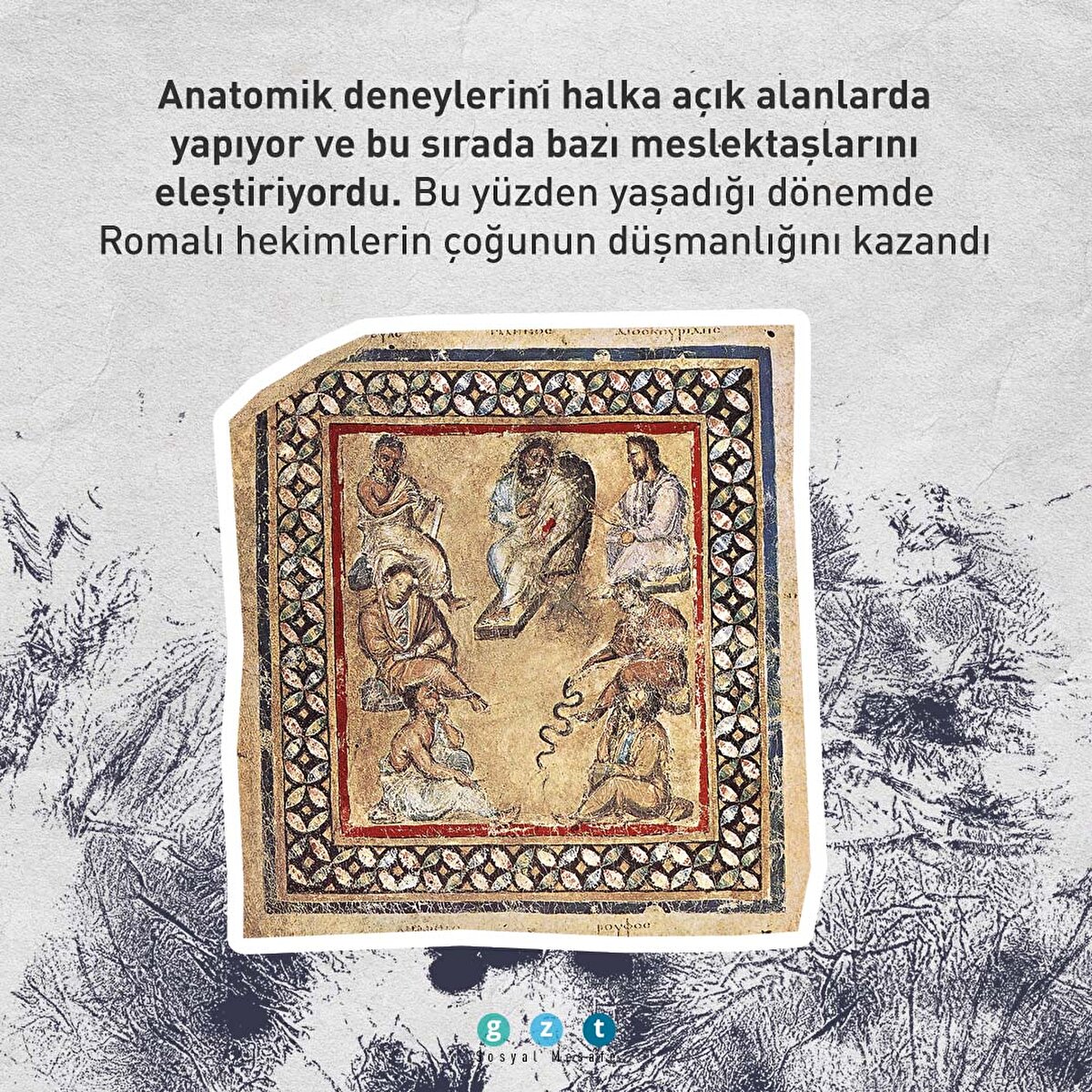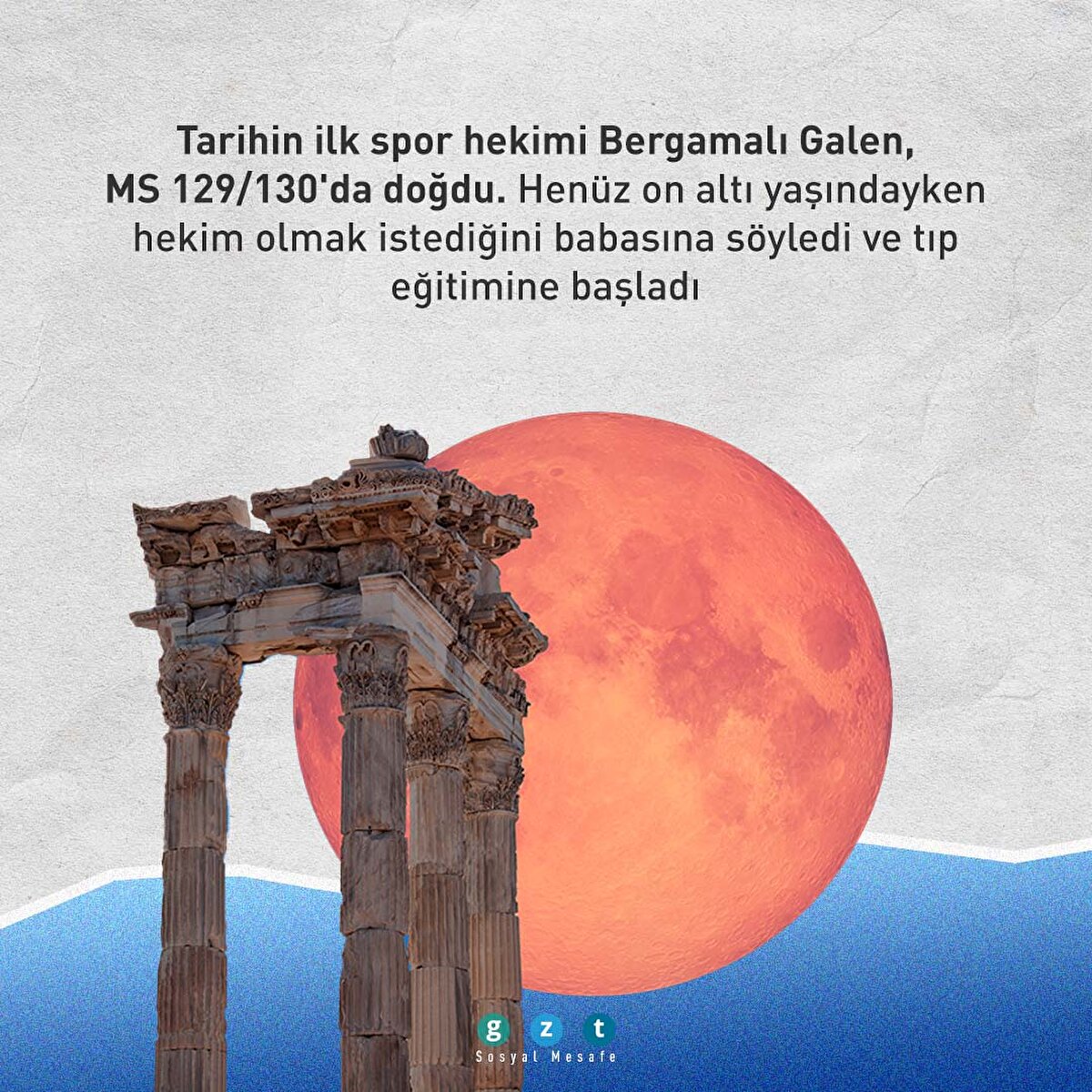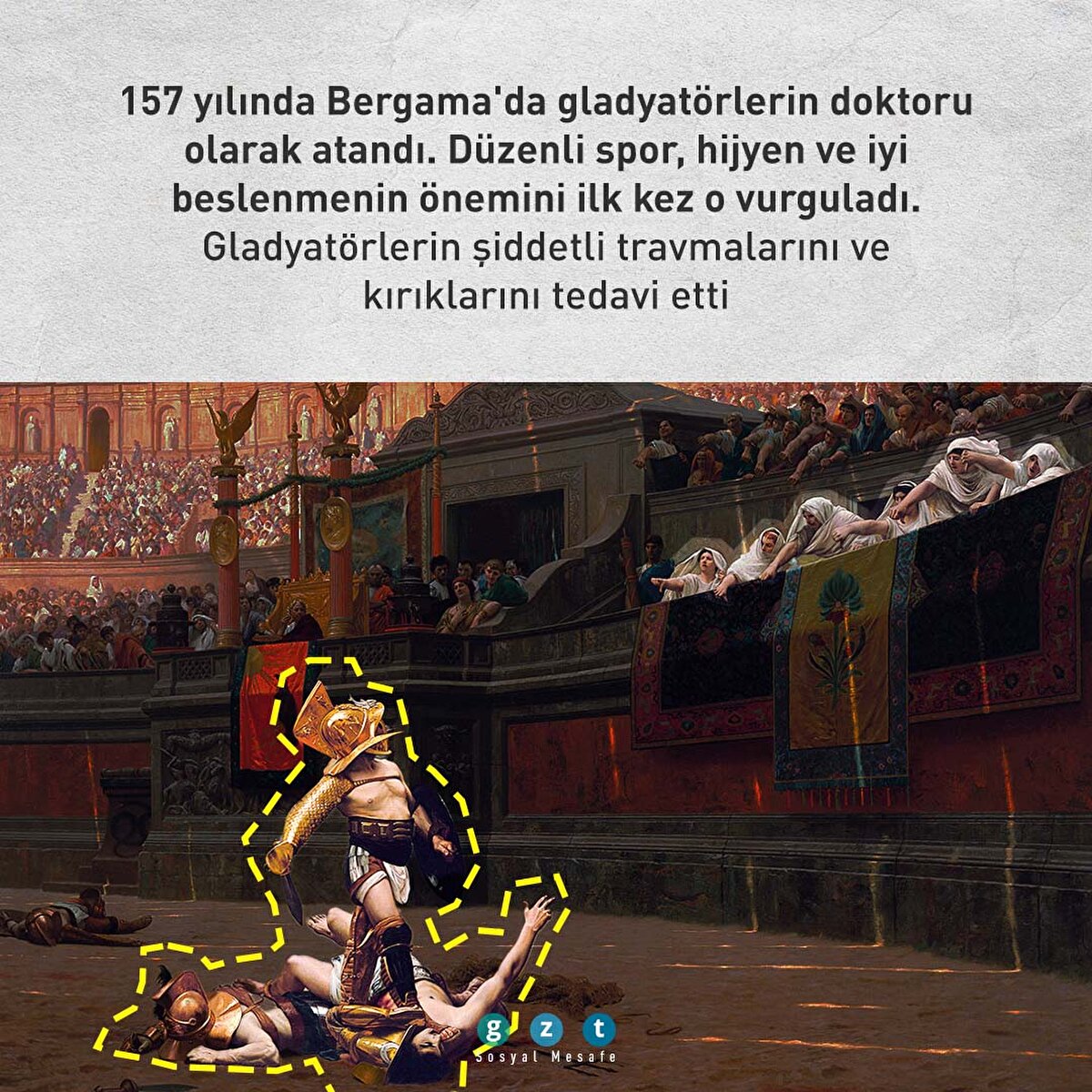 Gladyatörlerin hekimi olarak görev yapan, gösteri sonrası kırıklarını ve travmalarını tedavi eden Bergamalı Galen, dünyanın ilk spor hekimiydi. İyi bir hekimin aynı zamanda iyi de bir felsefeci olması gerektiğini savunan Galen, MS 216'da öldüğünde geriye pek çok kıymetli eser bıraktı. Dolaşım sistemi konusunda yaptığı çalışmalar sonucunda tıpta 'Galen Veni' olarak bilinen toplardamara adı verildi. Geliştirdiği ilaçların yapılıp satıldığı 'Apotheca adlı mekanlar, bugünkü eczanelerin başlangıcı olarak kabul edildi. Tıp tarihinde ilklerin babası olan Galen, Roma İmparatoru Marcus Aurelius tarafından 'Hekimlerin İmparatoru' ibaresi ile onurlandırıldı.